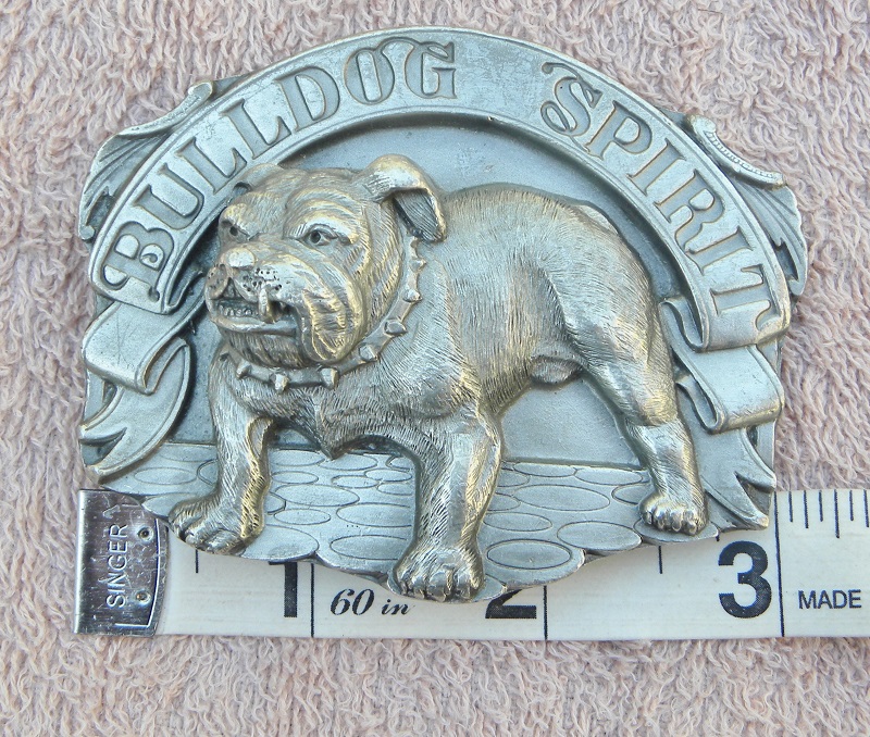 You are viewing a preowned Vintage USA 3" pewter post/hole Western style BUCKLE for up to a 1/75 Belt. Made by Siskiyou Buckle Co in Ashland, OR & it is dated 1992 on the back. The front shows a 3D banner that reads BULLDOG SPIRIT and underneath:  a goodlookin' tuff Bulldog wearing a spiked collar. Very cool little buckle. 43 universities have a Bulldog mascot...along with more than a few Western USA high schools. Please look at all the photos so you know exactly what you are buying. Measurements: Total length: 3”~ Tall: 2 &3/8". It has some scratches and rubs.. but still kinda nice. Thanks for looking.