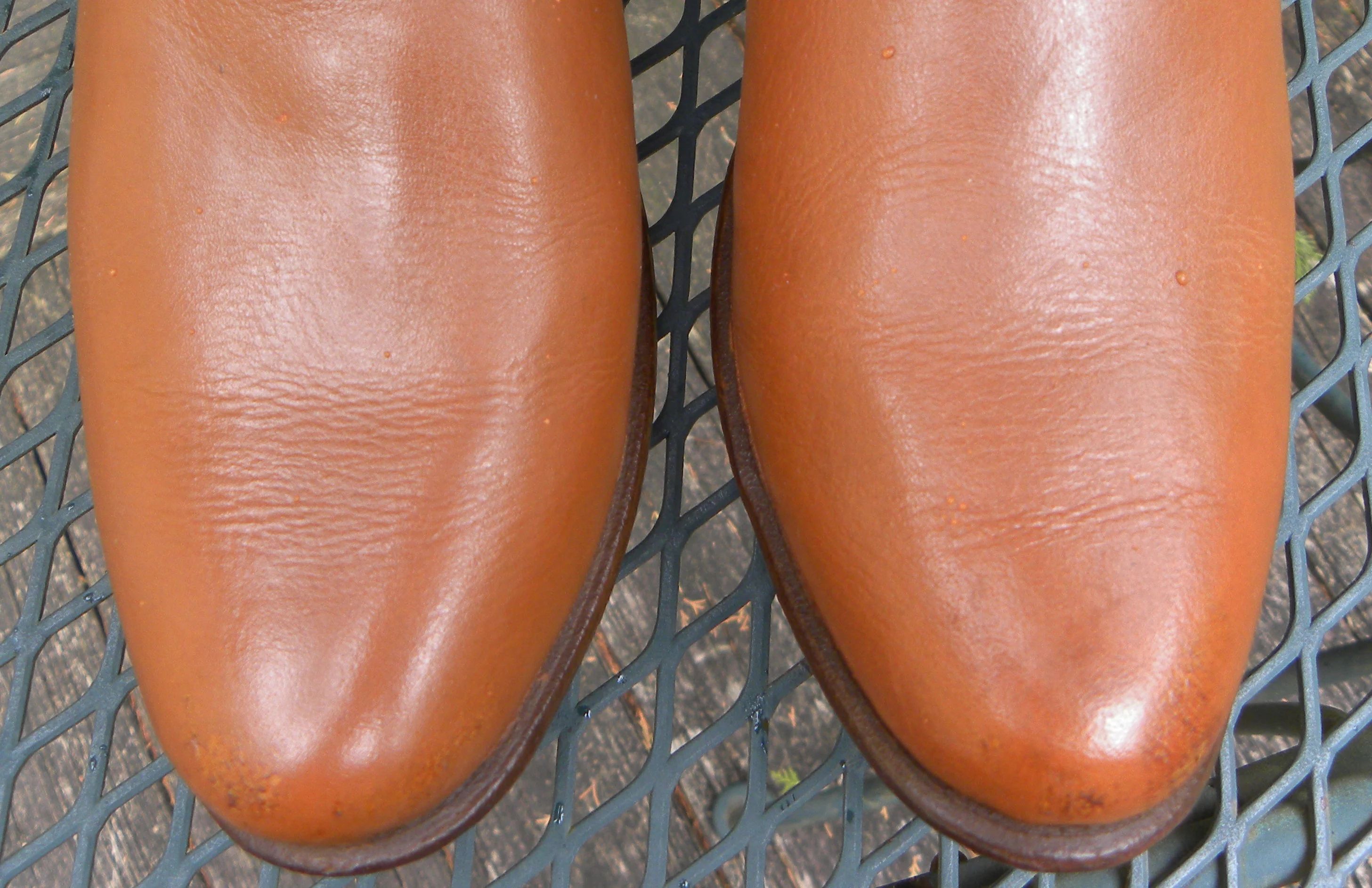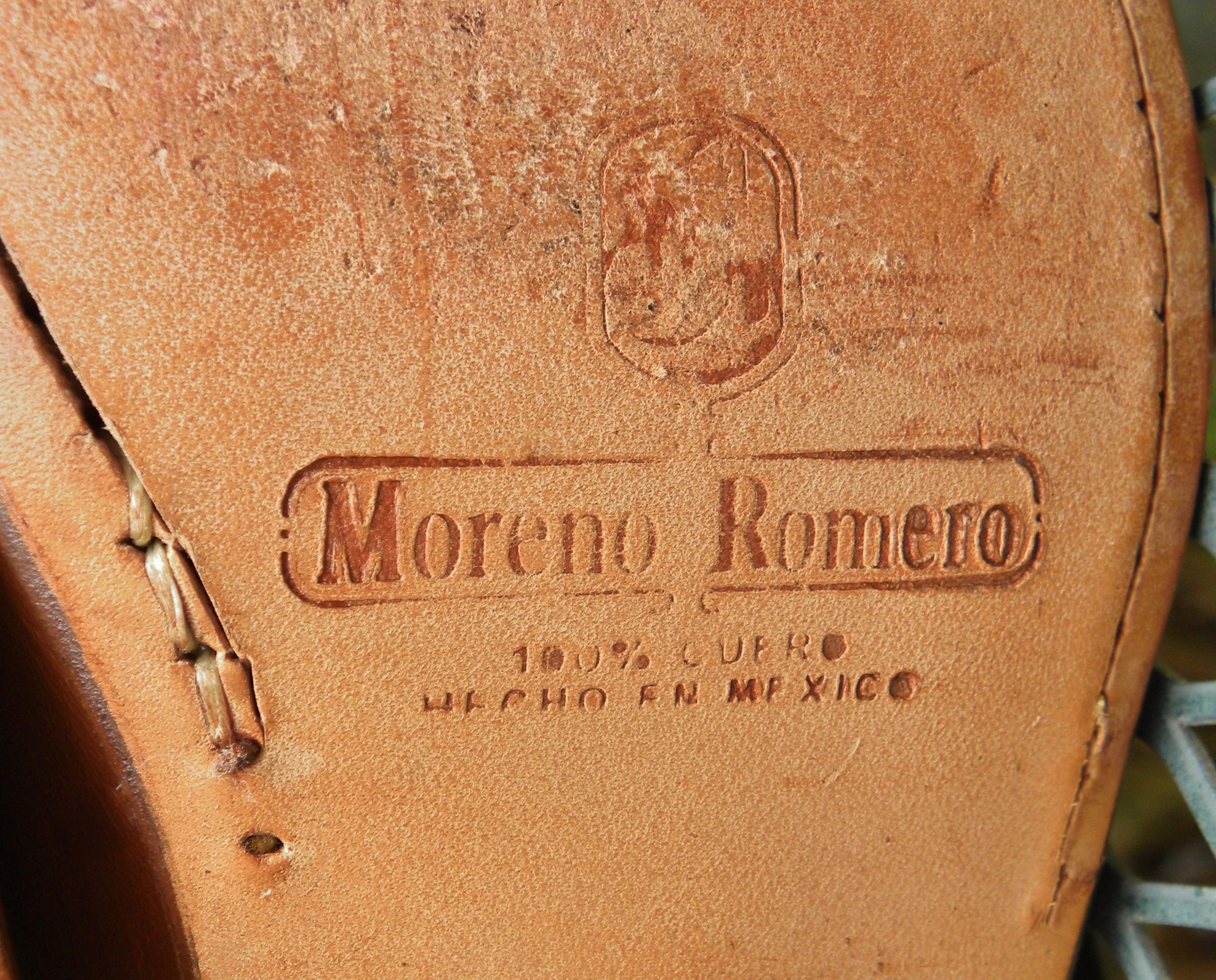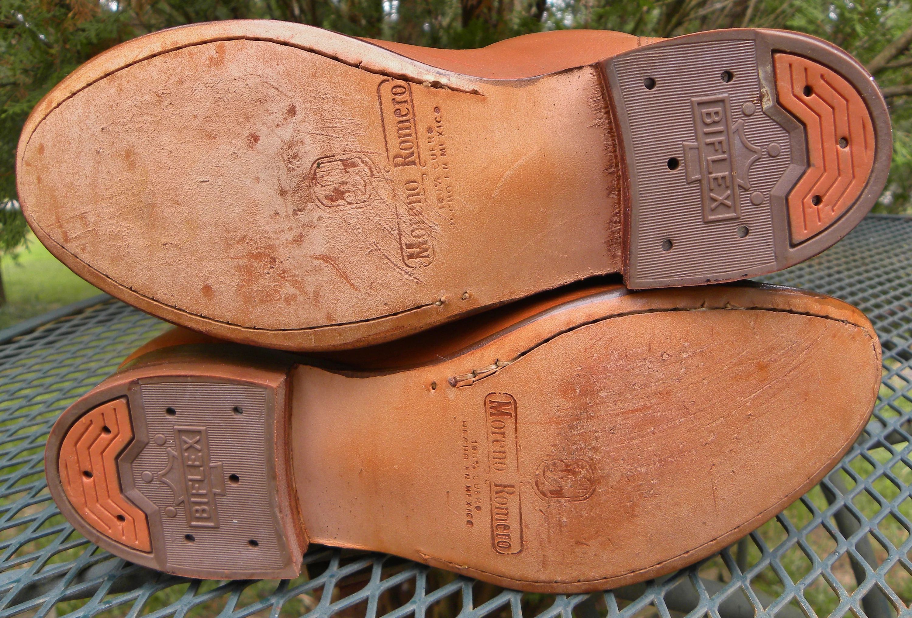This listing is for a preowned pair of Vintage Mexico Moreno Romero LEATHER mid-calf Boots for a Lady is size 6.5... but please measure your own boots, which is mandatory for a good fit. The color is a oranagey-carmel. These 12” tall boots have 3.75" X 3.75" Horseshoe sewn on the outside upper. They have stacked block heels, smooth leather outsoles, semi-pointed toes and double stitching at the stress points. The leather is smooth and supple. NOTE on condition: There is some rubbed spots on the toes. There is wear on the bottom soles.Please look at all PHOTOS so you know exactly what you are buying. OUTside Measurements: Bottom sole>pointed toe to back heel edge (down the side of the boot) :10 &3/8”~~Across the outside ball of the foot(width): 3.5”~~shaft height: 12”~~circumference around top edge at dip: 14.25” ~~ heel height: 7/8”. Thanks for looking.