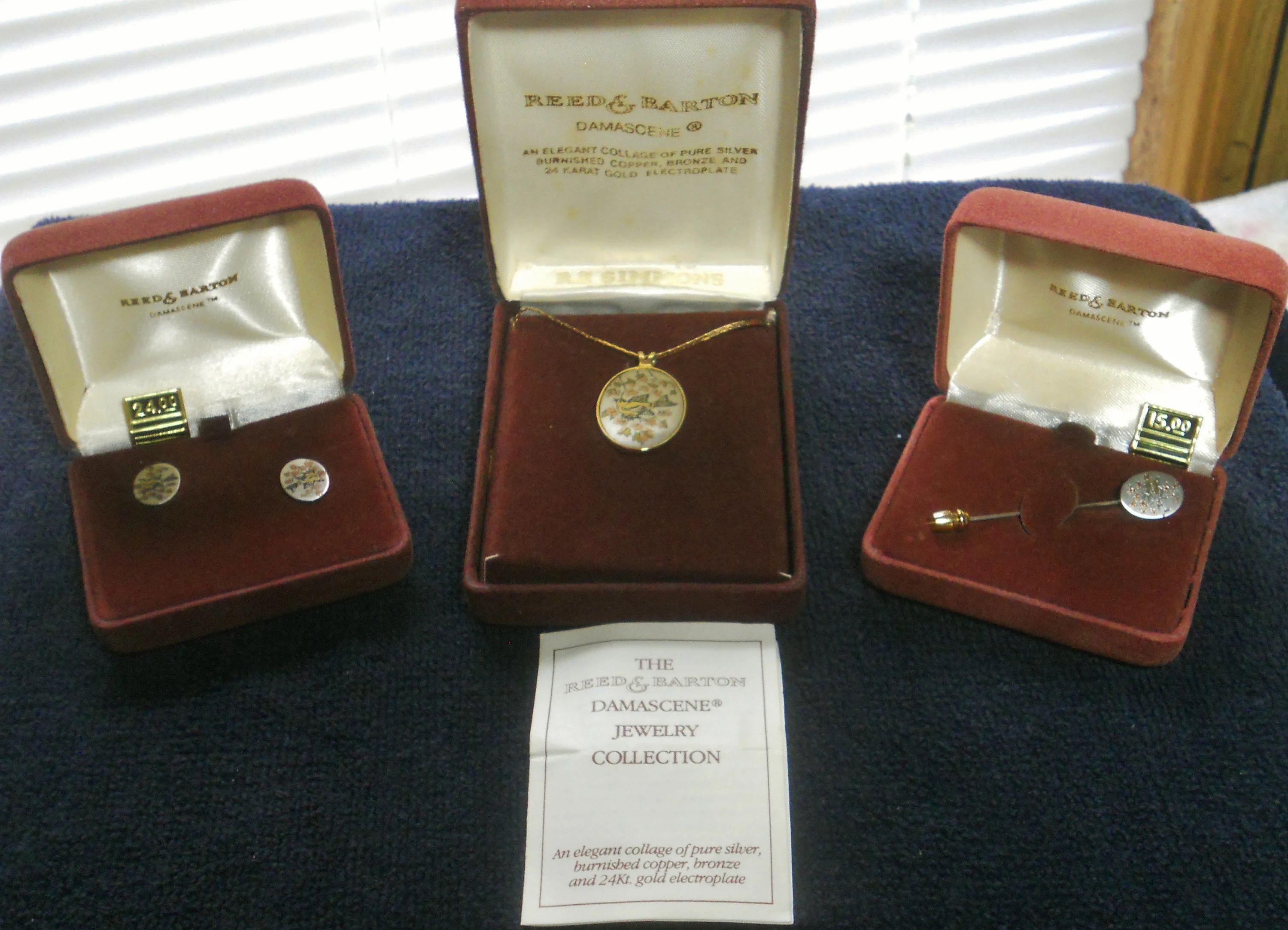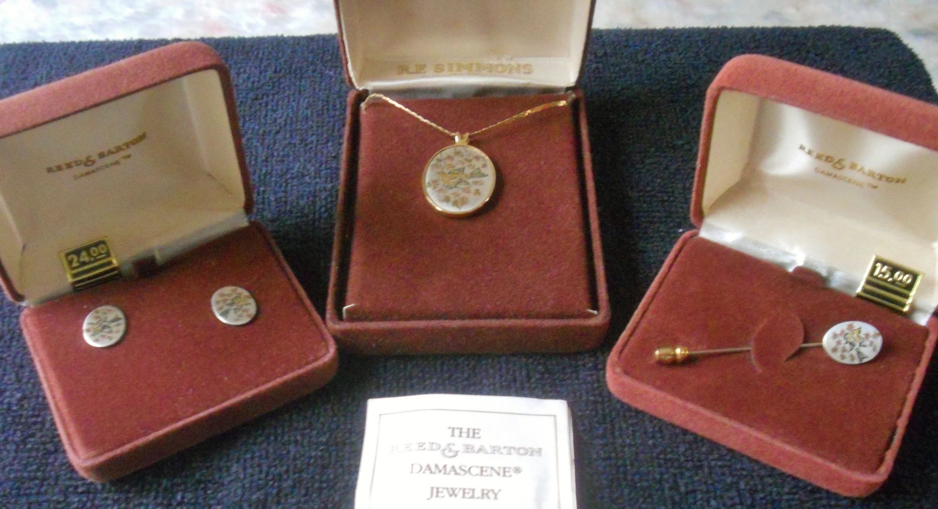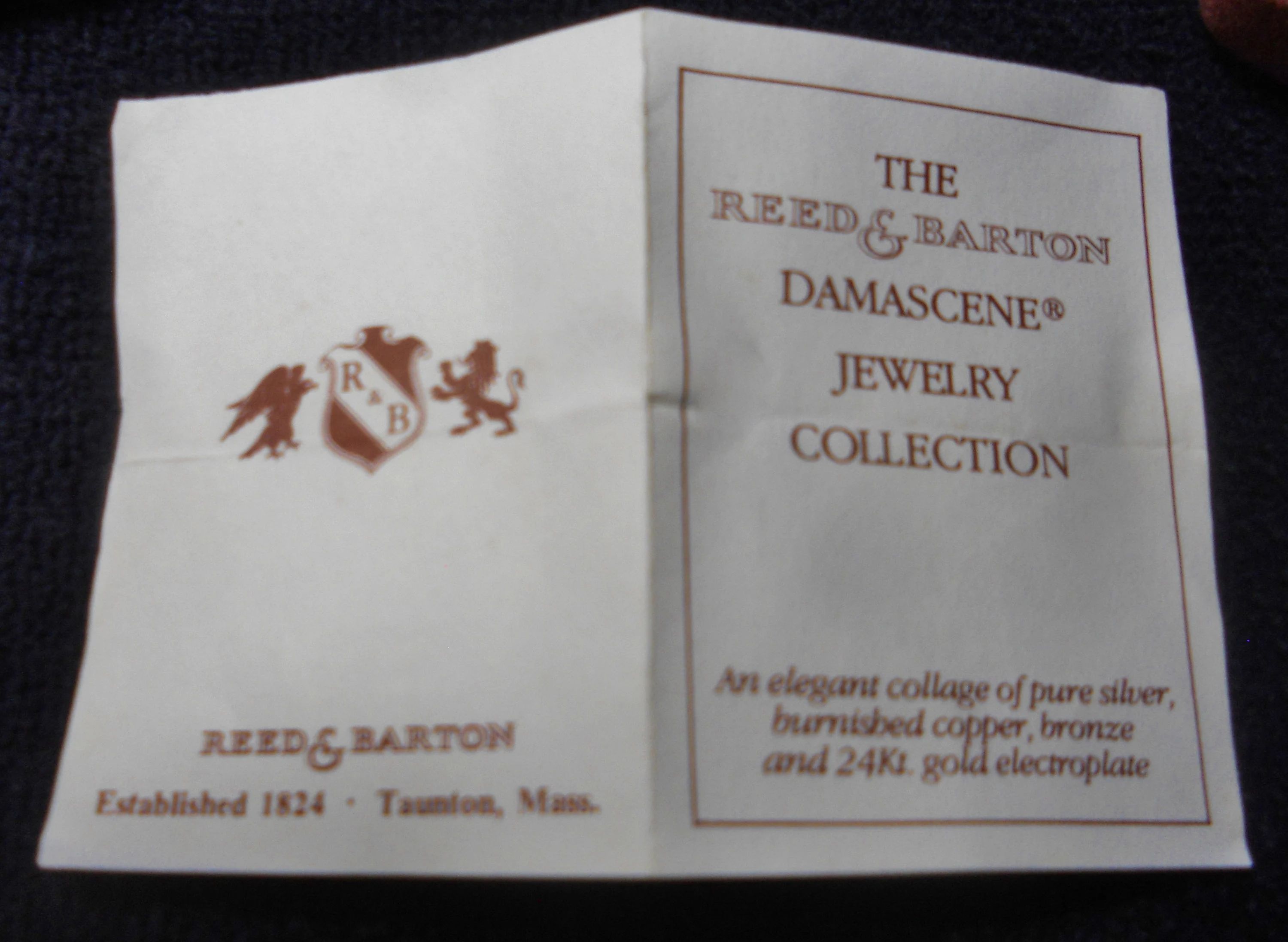 You are viewing a Vintage NOS 3 piece MATCHING LOT of Reed & Barton Damascene JEWELRY . DAMASCENE: An elegant collage of pure silver, burnished copper, bronze and 24Kt. gold electroplate. 1.) Bevel Set Oval Bird pendant= 1 &1/16" Tall X 75"Wide on a 17.75" long golden chain with a circular clasp. 2.) Oval stick pin = .5" Tall X 3/8" Wide and 2 & 1/8" total length with an end slide knob. 3.) Pierced Post style Oval Earrings : .5" Tall X 3/8" Wide with golden scrolled backs. Made In The USA! These pieces are NOS in their respective boxes with 2 of them still having the 1980 prices in them. The outside of the boxes shows some age and scratches. Still, my pictures do not do this little collection justice. Perfect for a special person in your life! This purchase will include a free gift of Jewelry. Thanks for looking.