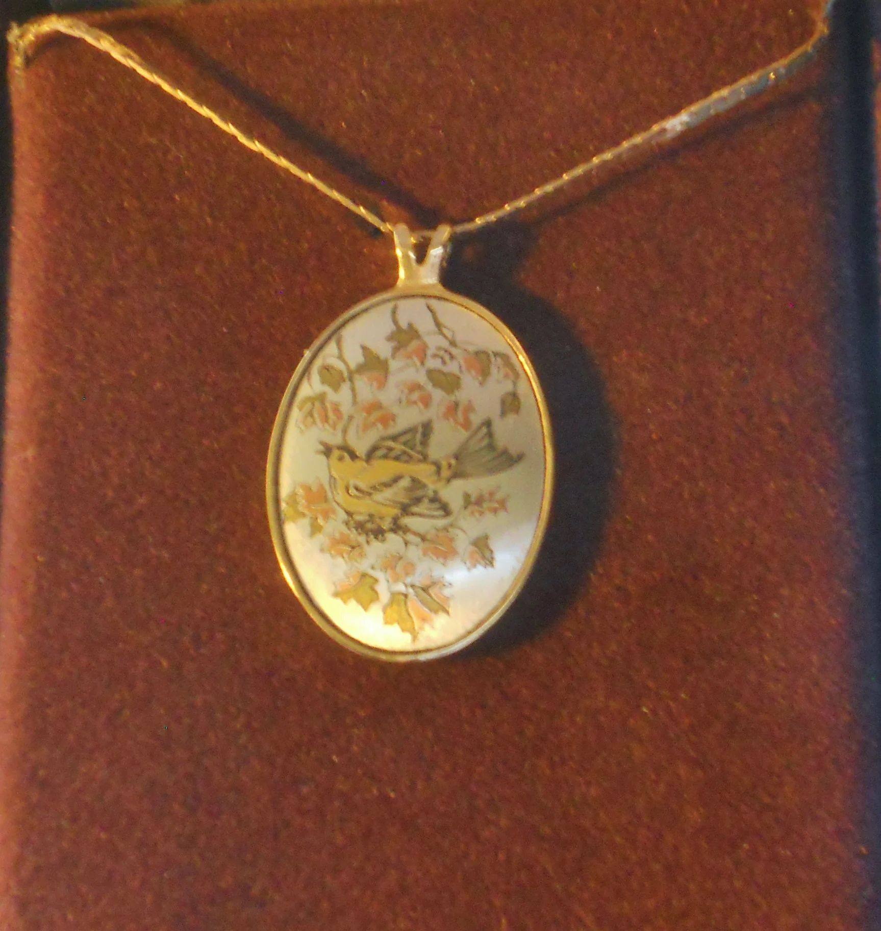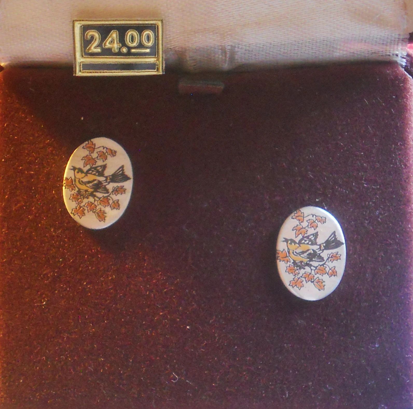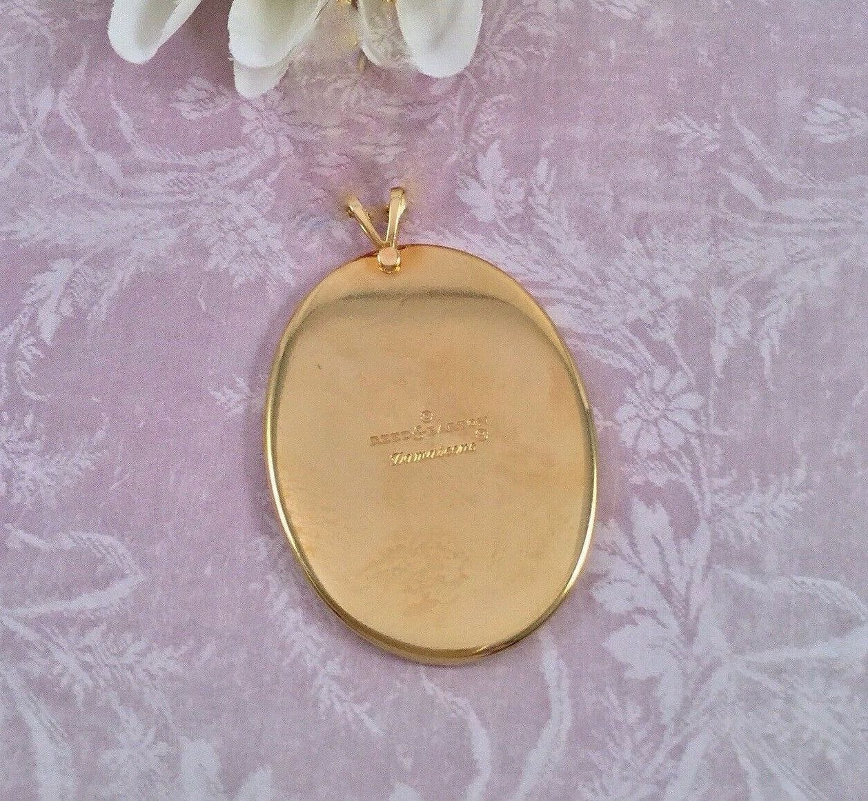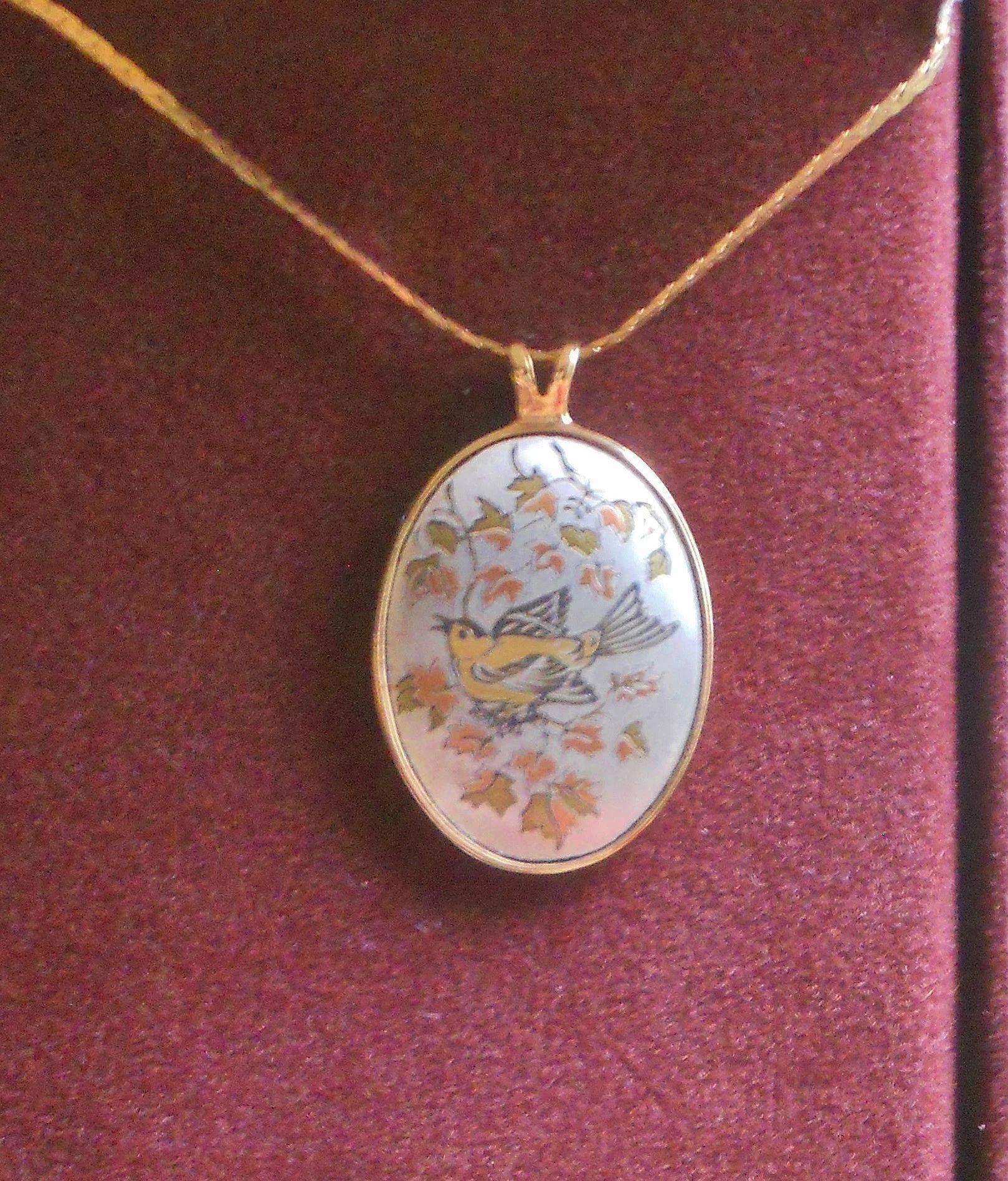 You are viewing a Vintage NOS 3 piece MATCHING LOT of Reed & Barton Damascene JEWELRY . DAMASCENE: An elegant collage of pure silver, burnished copper, bronze and 24Kt. gold electroplate. 1.) Bevel Set Oval Bird pendant= 1 &1/16" Tall X 75"Wide on a 17.75" long golden chain with a circular clasp. 2.) Oval stick pin = .5" Tall X 3/8" Wide and 2 & 1/8" total length with an end slide knob. 3.) Pierced Post style Oval Earrings : .5" Tall X 3/8" Wide with golden scrolled backs. Made In The USA! These pieces are NOS in their respective boxes with 2 of them still having the 1980 prices in them. The outside of the boxes shows some age and scratches. Still, my pictures do not do this little collection justice. Perfect for a special person in your life! This purchase will include a free gift of Jewelry. Thanks for looking.