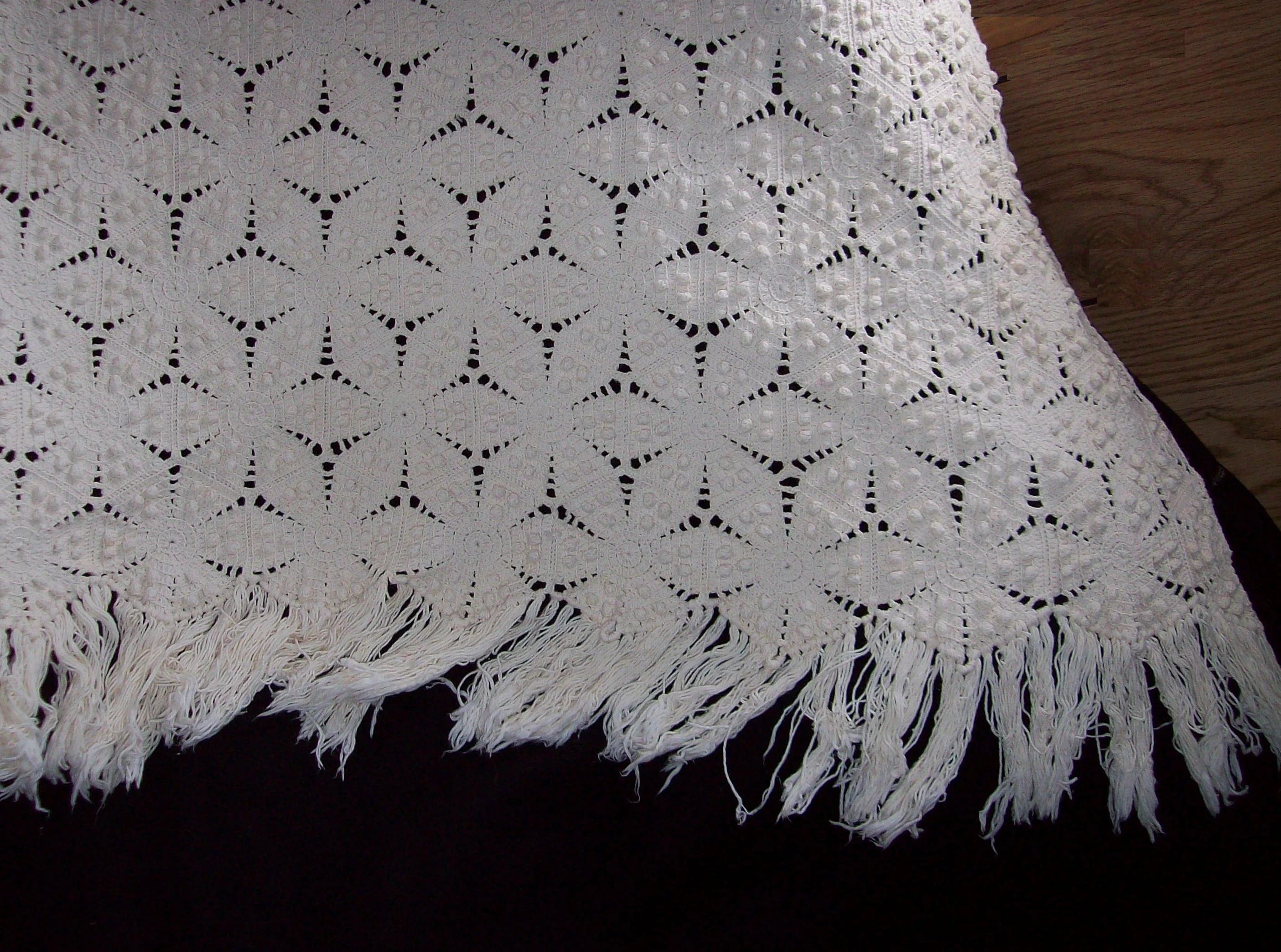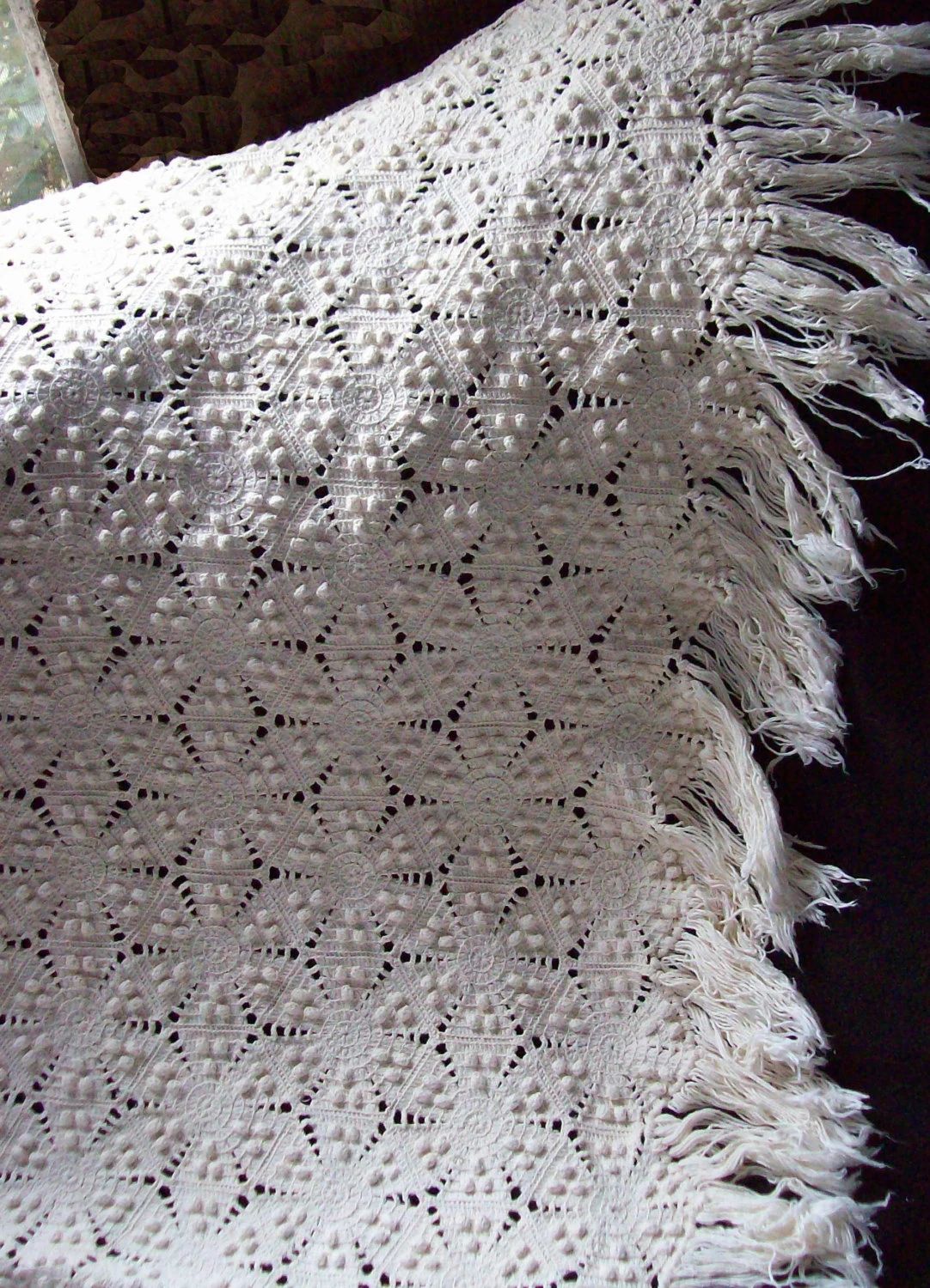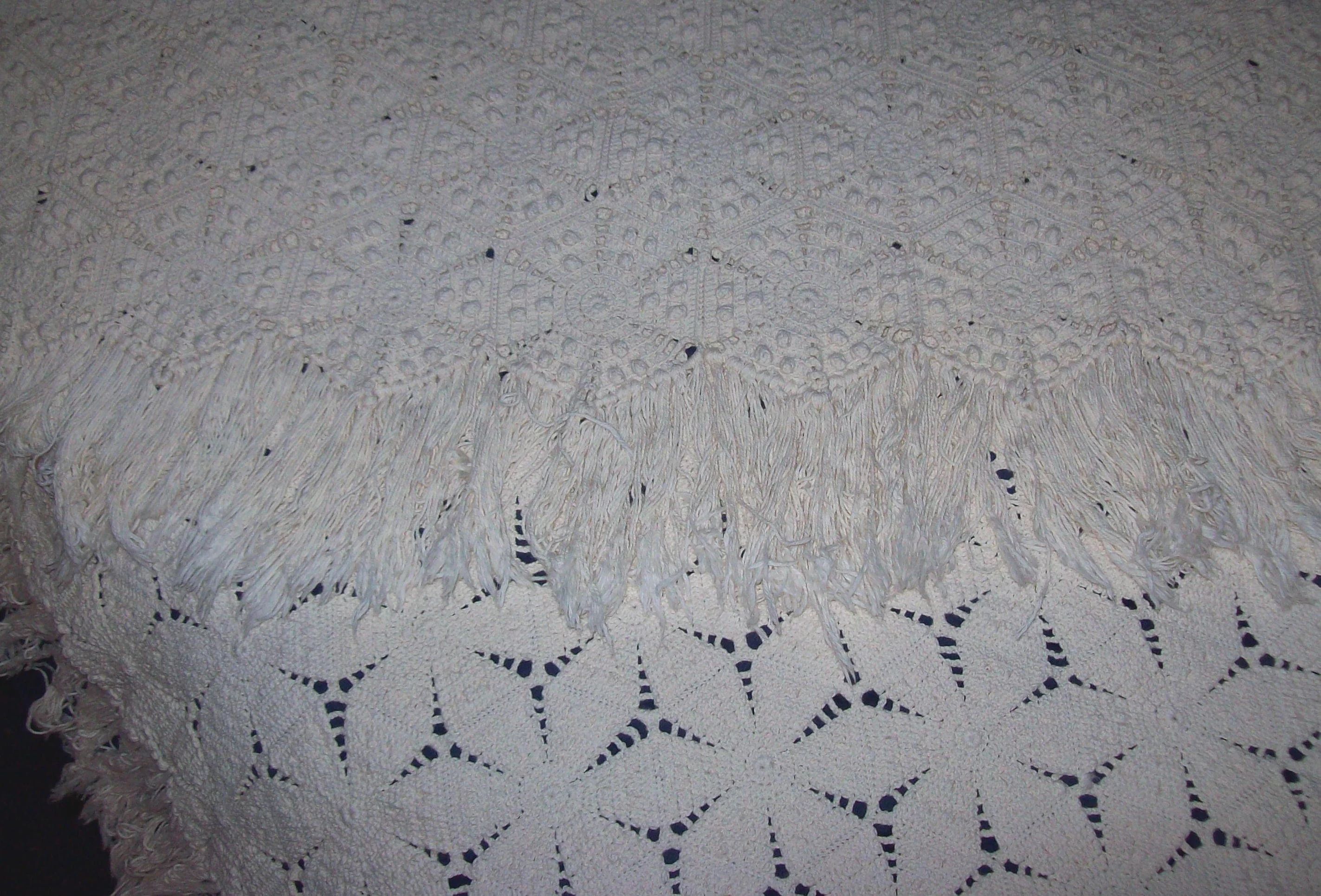 You are viewing a handsome 92" X 76" VINTAGE Antique Handmade Crocheted Quilt / bedspread / Coverlet for a full Bed. It could "decorate" & drape a Queen bed but would not extend down the sides very far. This spread is exquisite and heavy quality weighting 8 Lbs ~ 14.6 oz. It is fringed on 2 sides and both front and rear patterns are beautifully different. One side is popcorn medallions or stars.. the other smooth 6 point stars. The 6 sided stars are 6" and the Medallions are nearly 4". I cannot say for sure but I think this item is pre 1950. Measurements are 92" X 76" including the fringe. This keepsake Coverlet is in good Vintage condition. It would be an exquisite Quilt for a Bed-n-Breakfast or a very Elegant Bedroom. This quilt weighs a whopping 9 POUNDS! Thanks for looking. FREE SHIPPING!!