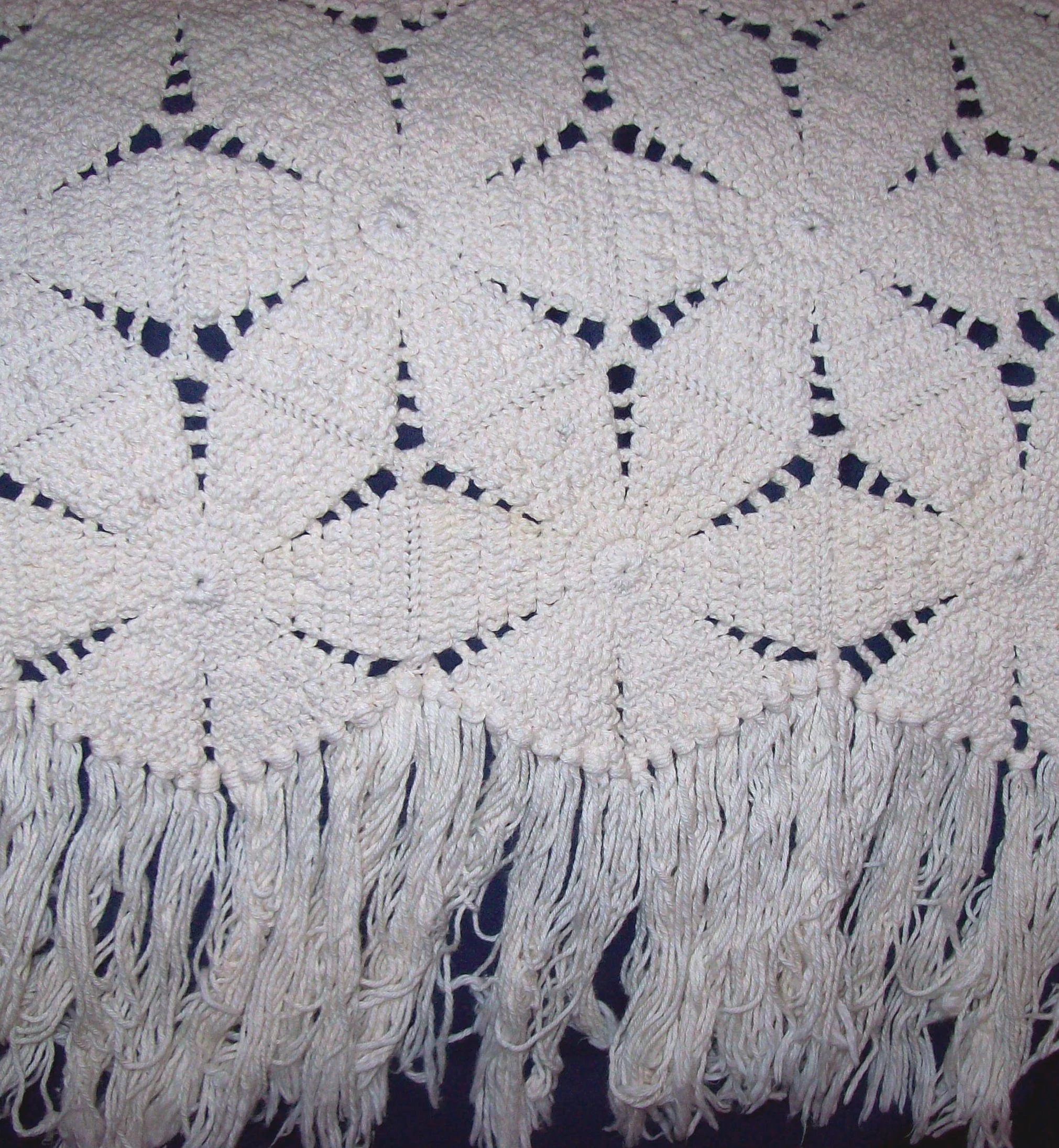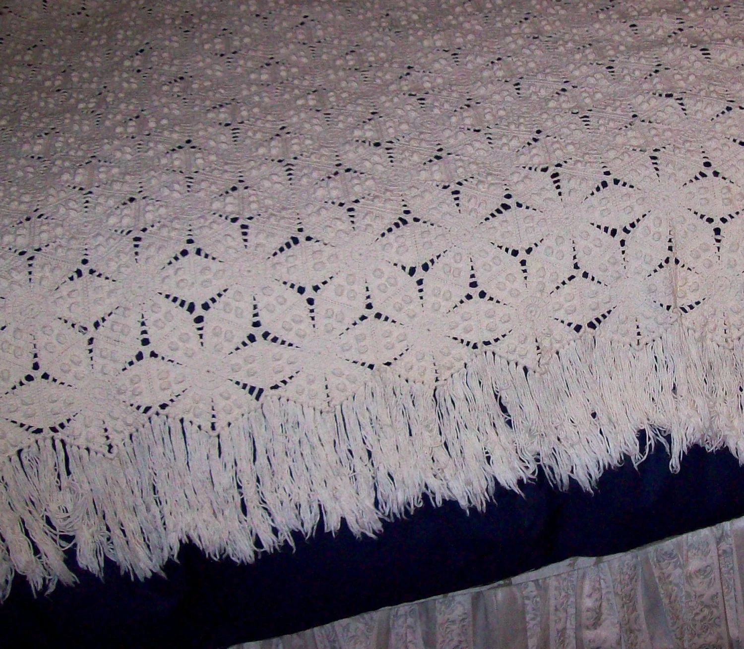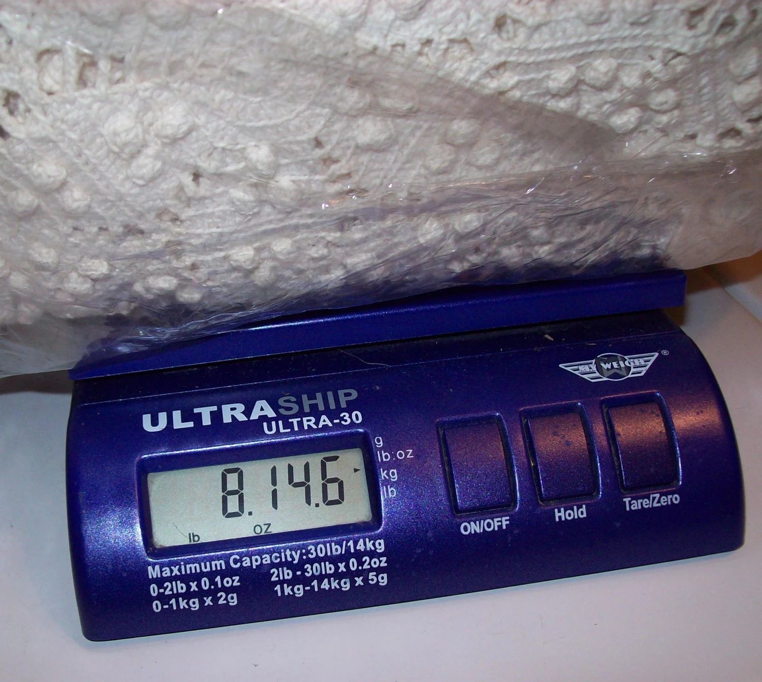 You are viewing a handsome 92" X 76" VINTAGE Antique Handmade Crocheted Quilt / bedspread / Coverlet for a full Bed. It could "decorate" & drape a Queen bed but would not extend down the sides very far. This spread is exquisite and heavy quality weighting 8 Lbs ~ 14.6 oz. It is fringed on 2 sides and both front and rear patterns are beautifully different. One side is popcorn medallions or stars.. the other smooth 6 point stars. The 6 sided stars are 6" and the Medallions are nearly 4". I cannot say for sure but I think this item is pre 1950. Measurements are 92" X 76" including the fringe. This keepsake Coverlet is in good Vintage condition. It would be an exquisite Quilt for a Bed-n-Breakfast or a very Elegant Bedroom. This quilt weighs a whopping 9 POUNDS! Thanks for looking. FREE SHIPPING!!