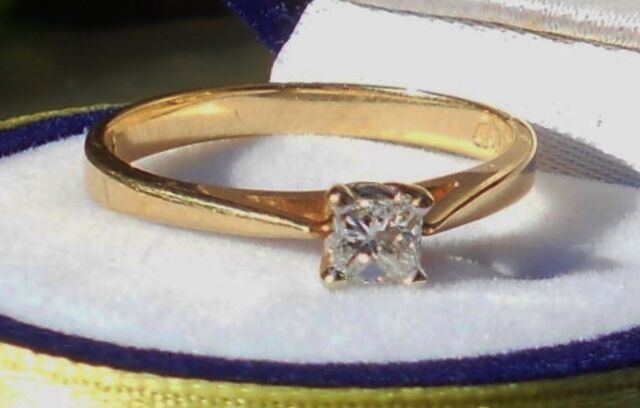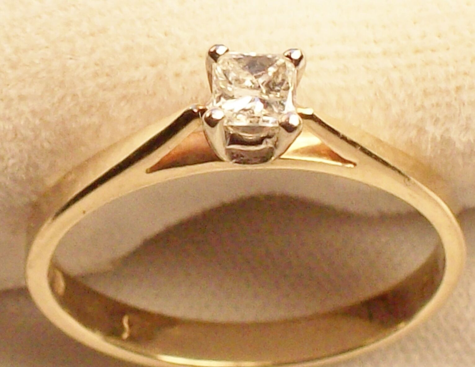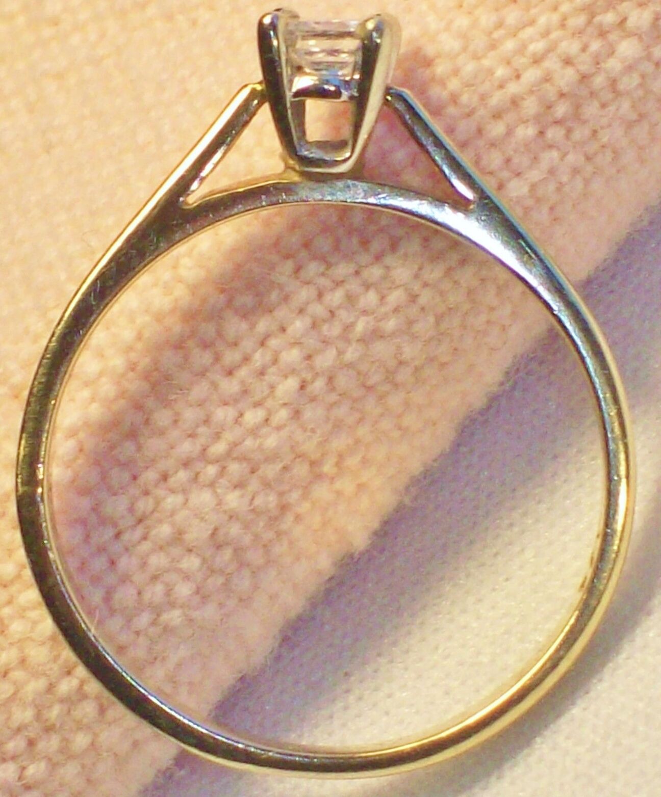 You are viewing an Estate (preowned) Natural Princess Cut Diamond Ring in Ladies size 7.25. This Diamond is set in a basic 4 prong raised setting..nice. The color of this Princess Cut diamond is G and the clarity is SI. The setting is 10 KT yellow gold, 1.5 Grams of it. This pretty ring is very simple & unpretentious. This could be a nice engagement ring but today women wear whatever they want. A Princess Cut Diamond is the best, in my opinion. This is a good price on this ring. It has some scratches on the band which I think would Buff out. FREE SHIPPING !