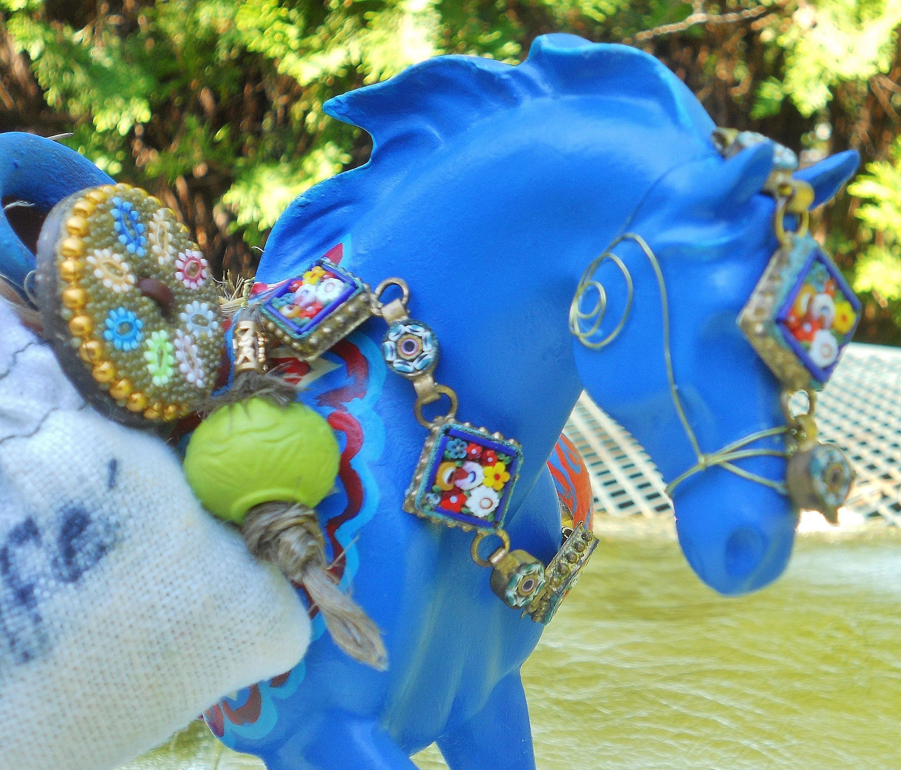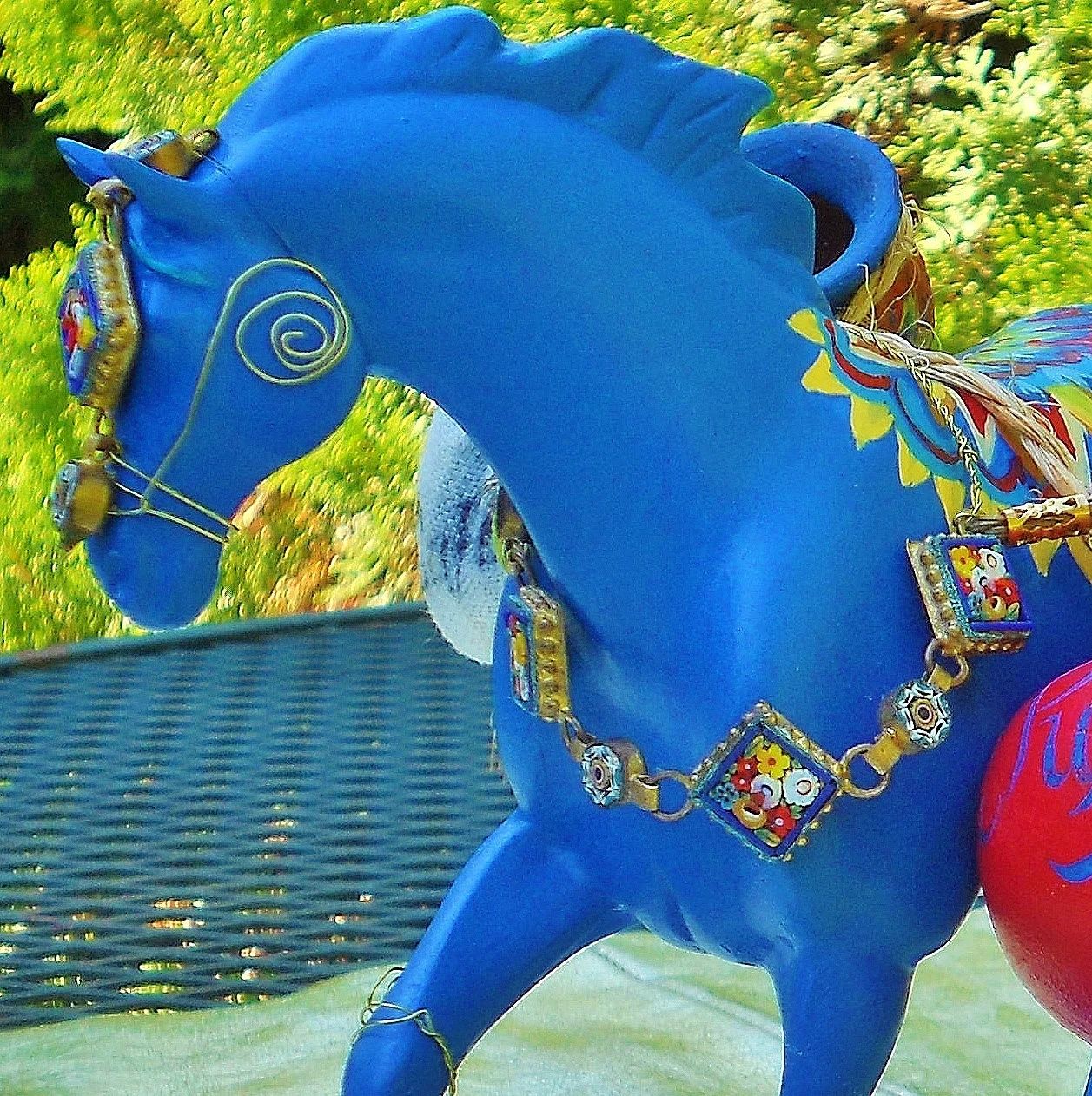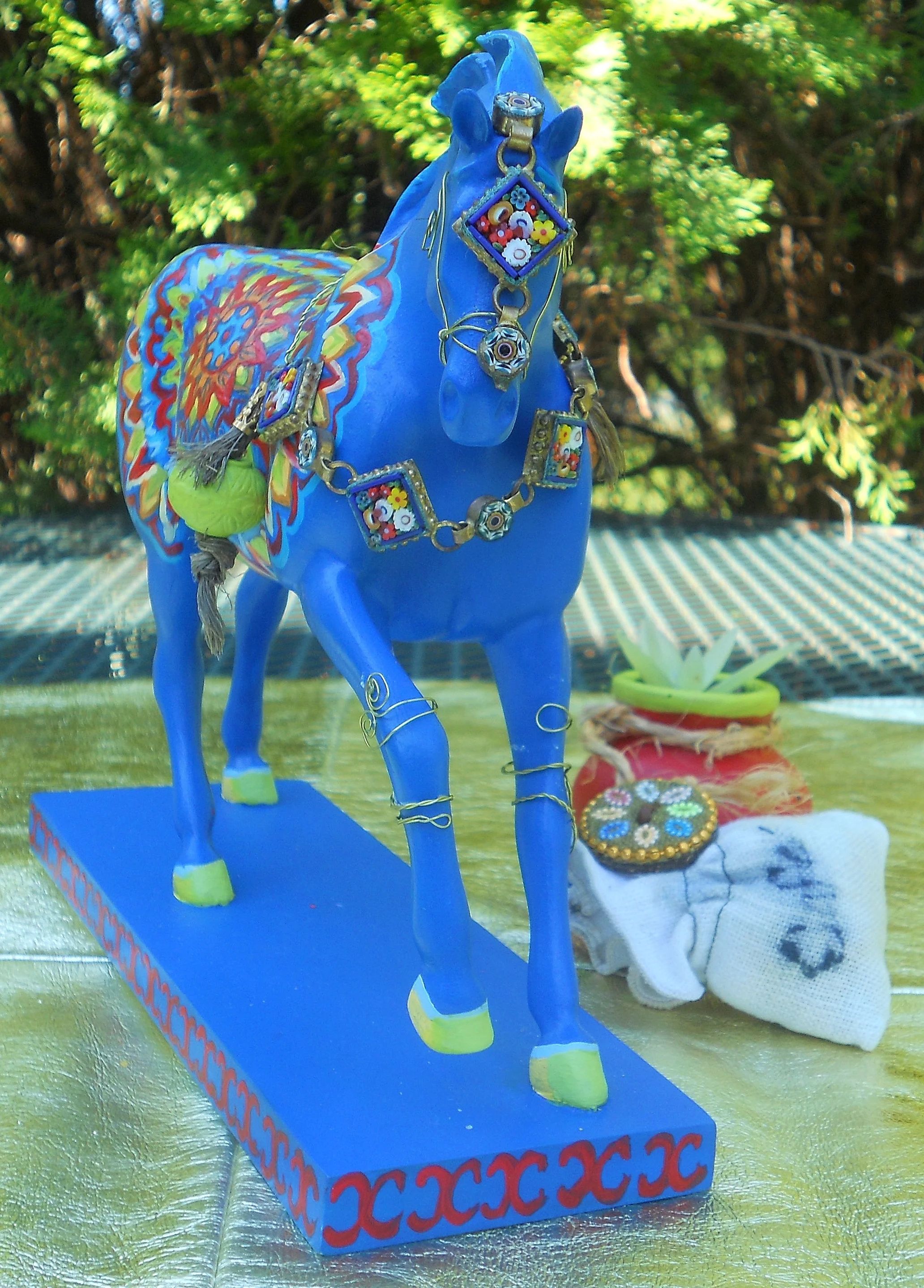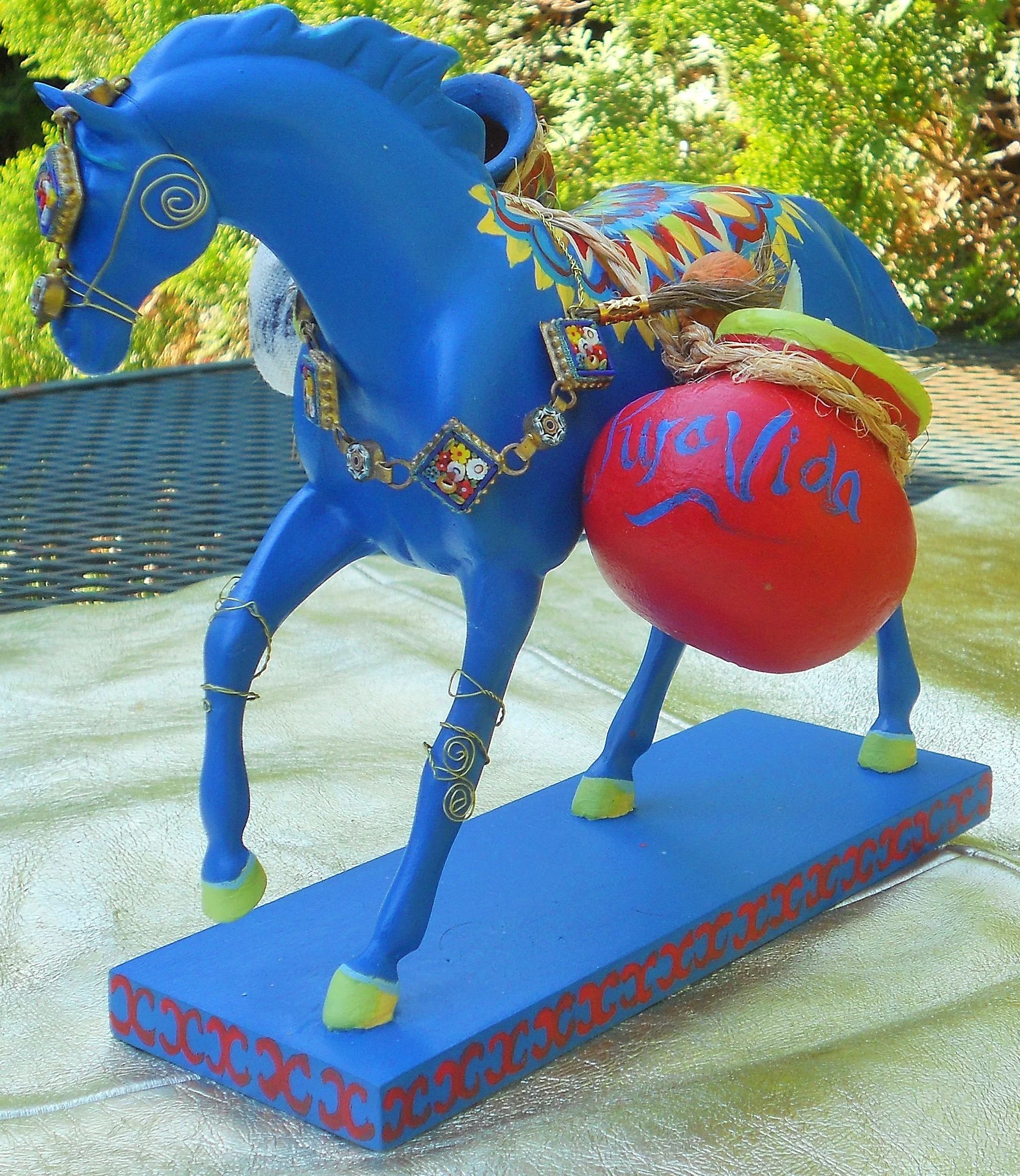 You are viewing a custom handpainted Pony called PURA VIDA. "Pura Vida" is the slogan for Costa Rica (see the excerpt below). PURA VIDA is an original, signed by the artist on both the small Trail of Painted Ponies placard and on the underside of Pura's Base. He is the only edition (1 of 1) But... he is also the First of 10 Ponies in this Series of: Various Countries Artistry & Horses. He is also the artists second Pony offering, overall. Pura Vida has the tradition of the Costa Rican Custom of "Oxcart Painting" detailed on his body (see excerpt below). There is no air-brushing on this pony, the work has been done totally by paintbrushes. His body is painted a Brilliant Deep Blue and the circular "Oxcart Wheel" is painted on him in vivid yellows, red, limes, lt blues. This bright, happy Oxcart wheel is painted on his side & continuing up & over his back. Encircling each of his front legs in intricately fashioned fine gold wire to imitate the fine detailing of the 24kt gold work on display in the Gold Museum located in San Jose. On his head is more scrolled gold wire and a headpiece consisting of an ornate square & 2 circles to compliment his head. The breast plate is identical to the headpiece except it finished on the ends with a painted wooden bead attached by common twine to the plate. Across the ponies back is common twine tied to a large bright red clay pot with "Pura Vida" scripted in deep blue & a linen drawstring sack of REAL coffee beans. It is finished off by a wee decorative version of a wheel in front of the coffee sack. The Breast Plate and the Pots can be removed at will, as shown. Pura has been finished & sealed with a brushed-on satin polyurethene to make him appear like CLAY Pottery. A letter of information/explanation will accompany each pony purchased. THIS ITEM IS NOT A TOY and is for display or collection only.