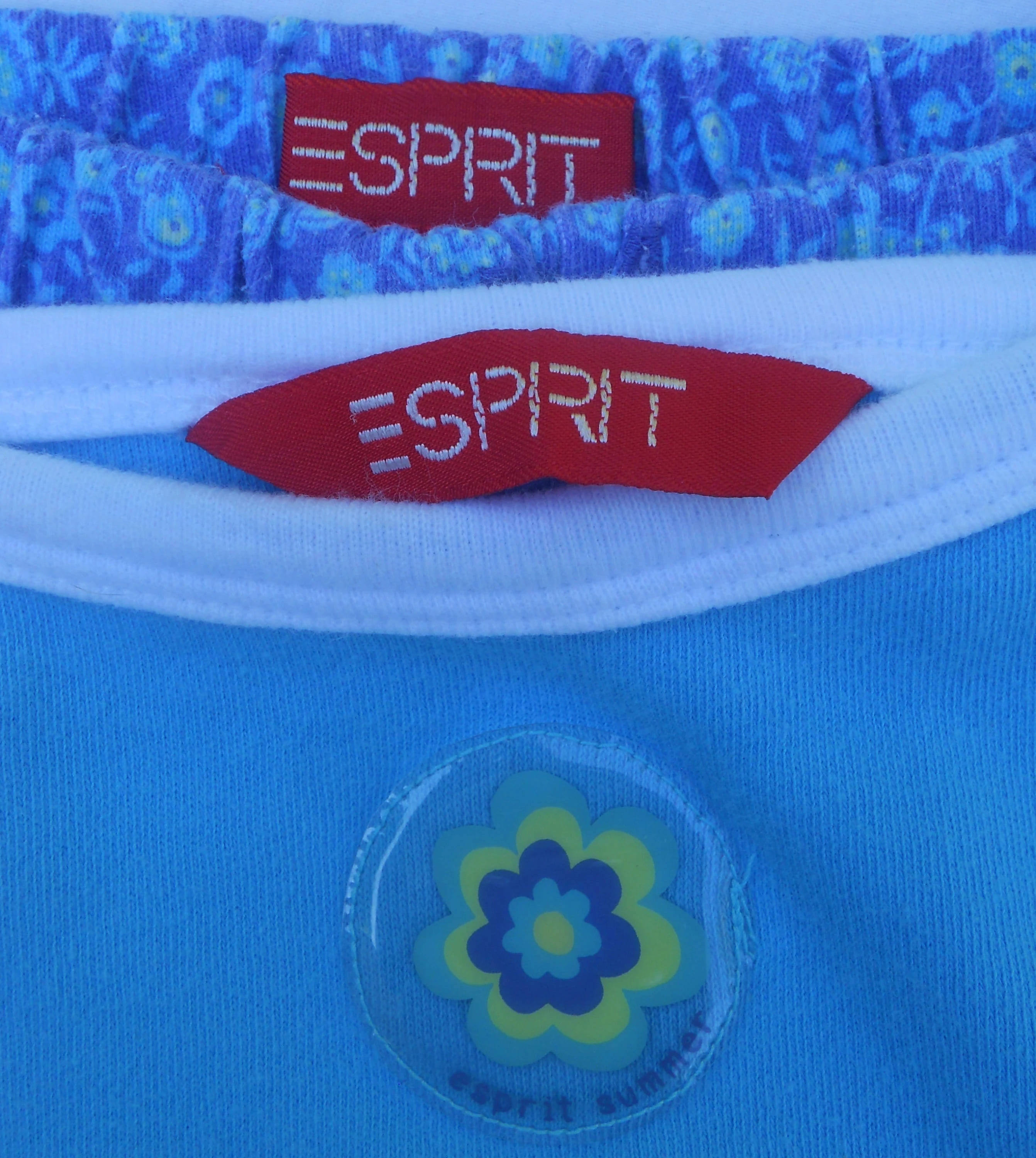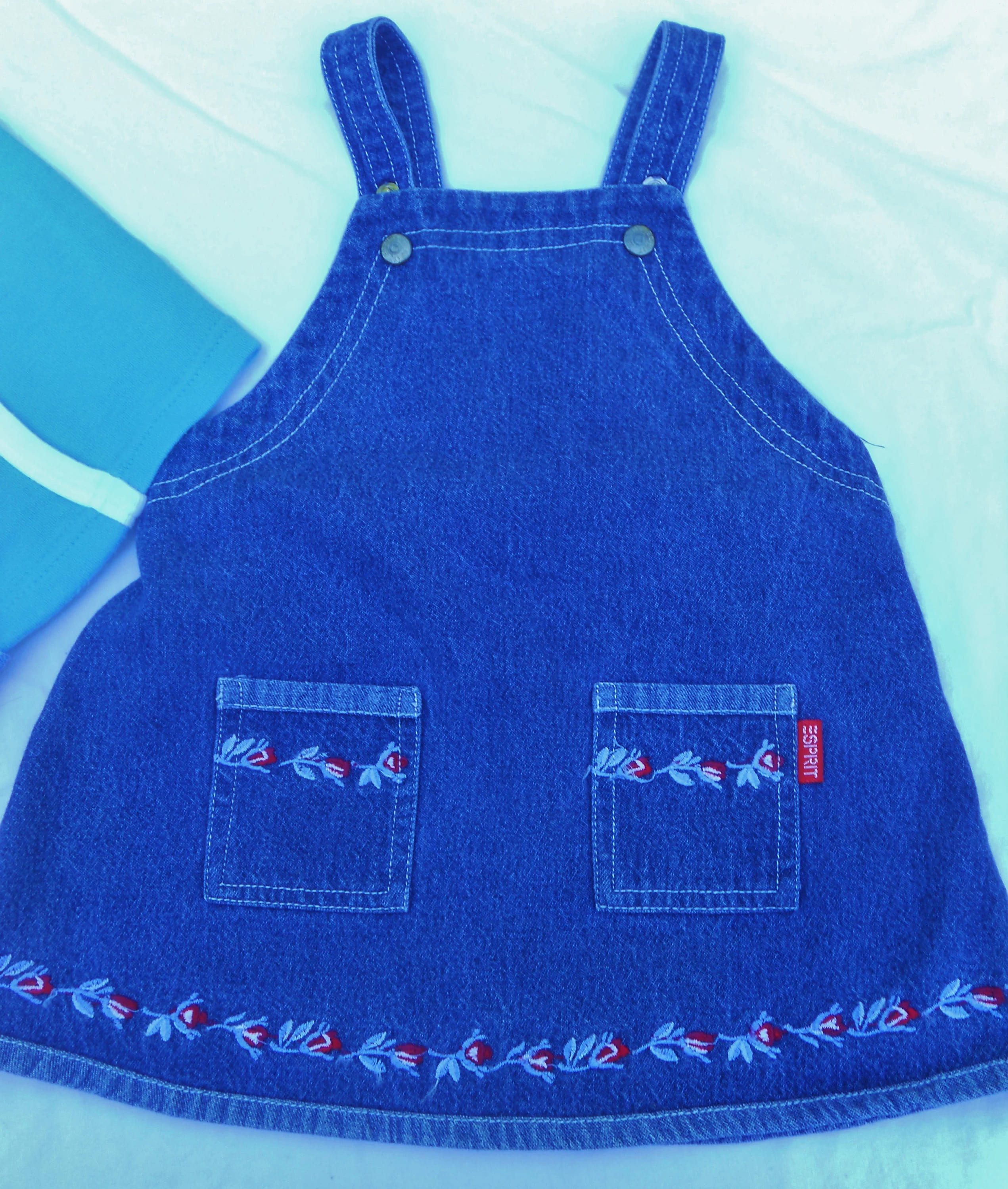 You are viewing a Vintage 3 Pieces of ESPRIT for a Baby Girl size 12 mos. There is a Blue Denim Jean Sundress/ with twin snaps on each shoulder strap and 2 cutout pockets on the front. There is little red rosebuds embossed on the hemline and pockets: 100% cotton denim. Then there is a 2 piece Capri Set with a sleeveless solid aqua-blue top with white trim & straps and a kangaroo pocket. The capris are a floral with an elastic waist & notched at the hemline bottom, also 100% cotton. The sundress is in very good condition and the 2pc capri set is In good condition & just slightly faded. If you are interested in Vintage Kids Brand name & eclectic items, Favorite me. I will be slowly listing many neat items! Thanks for looking!