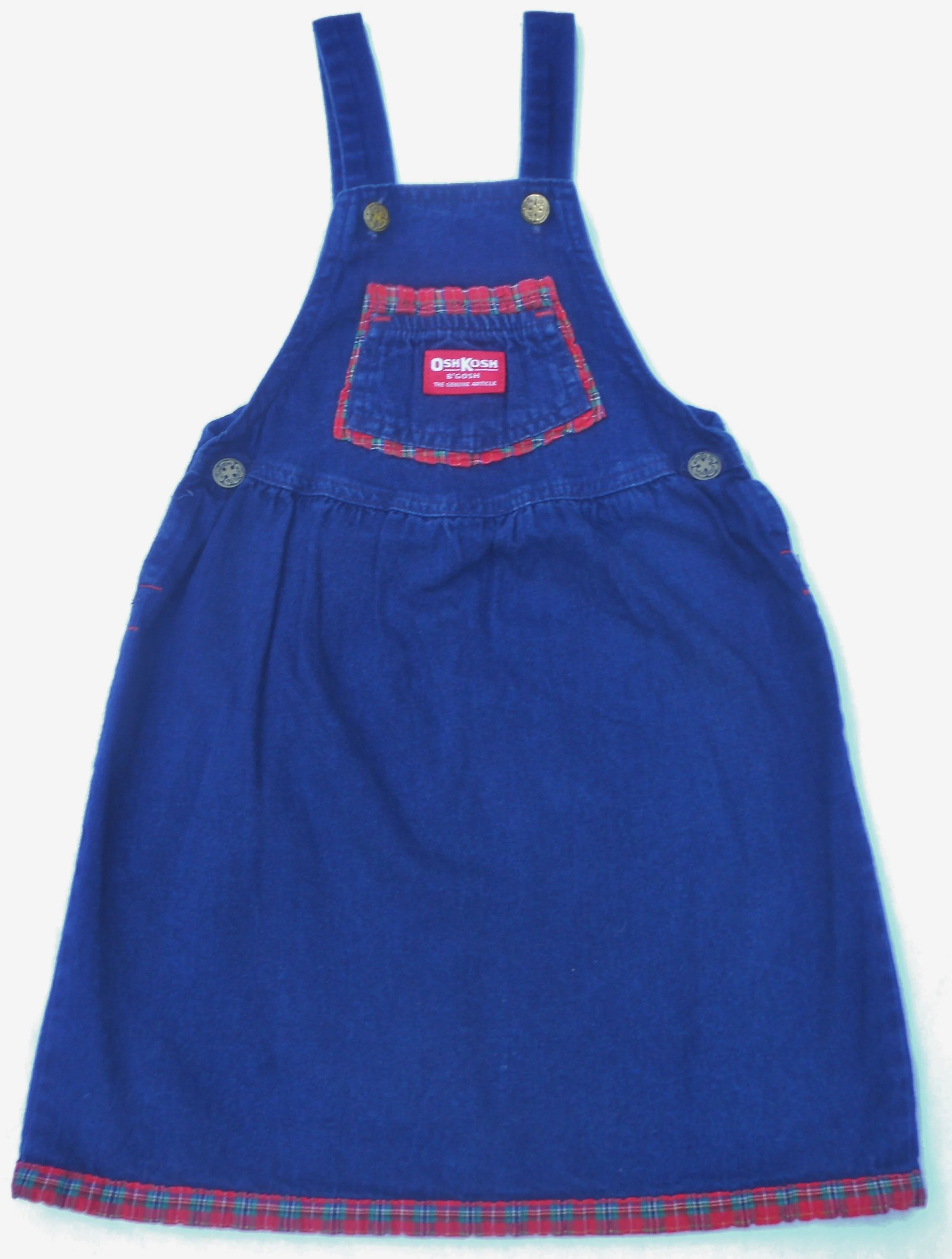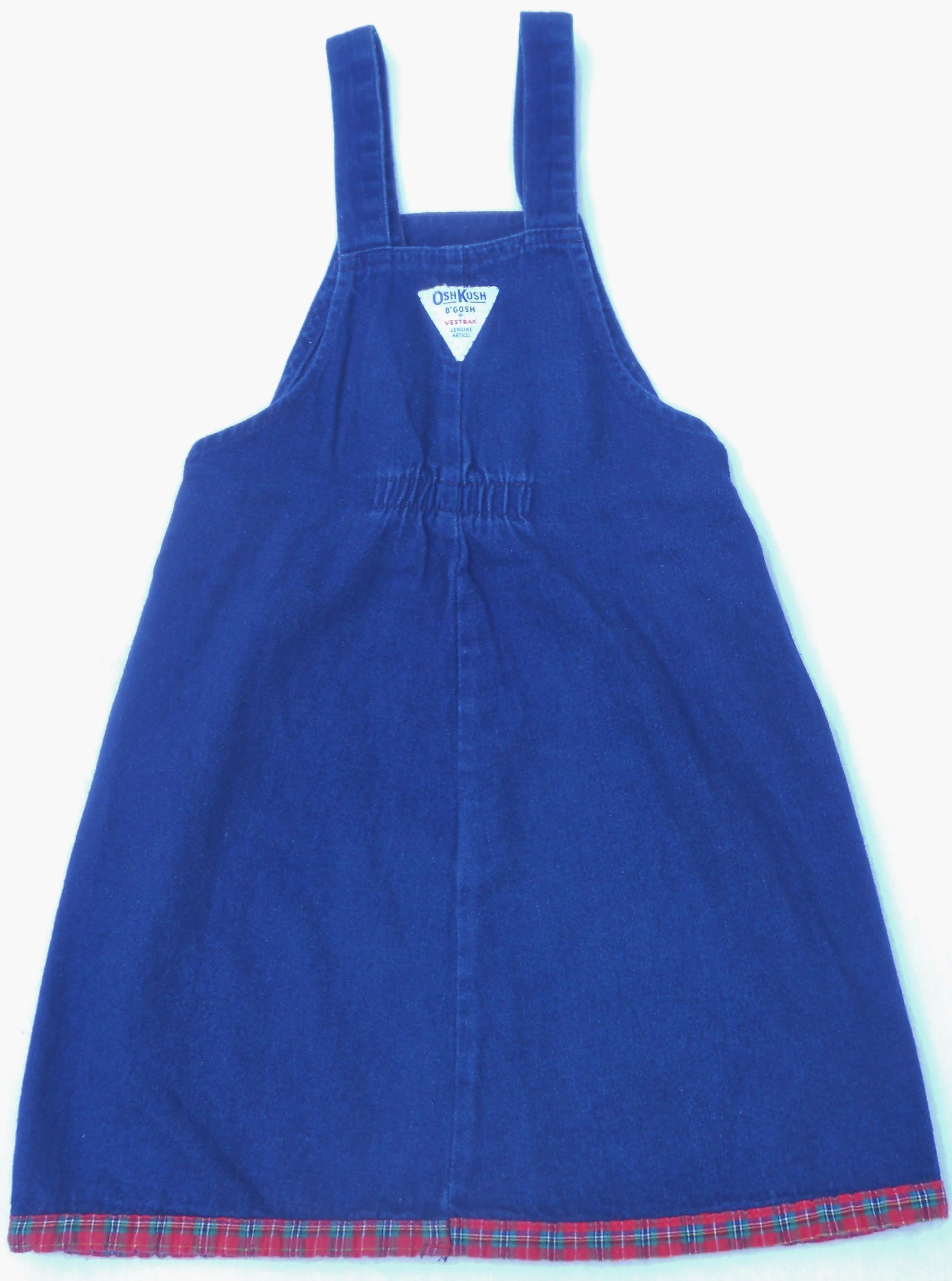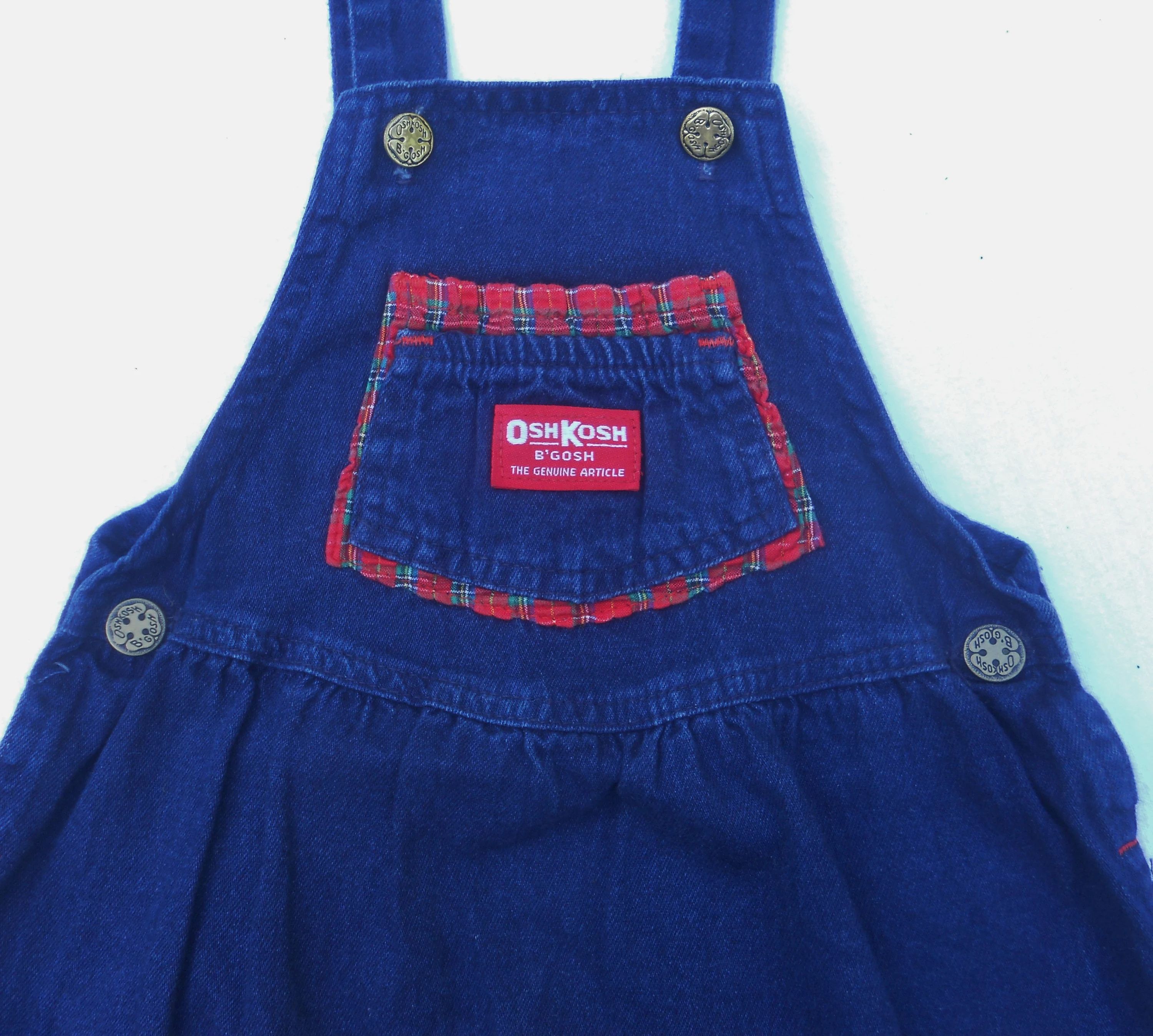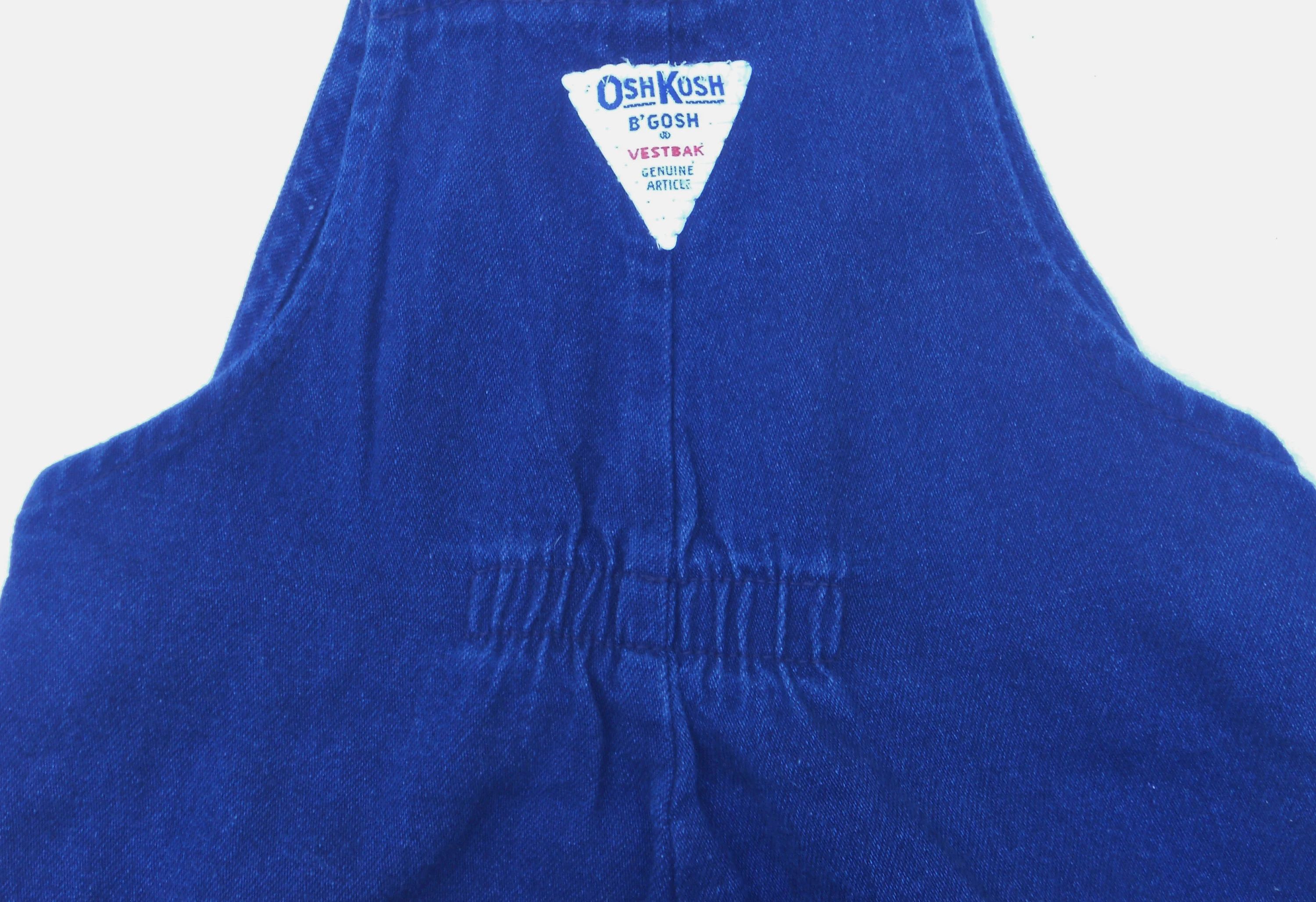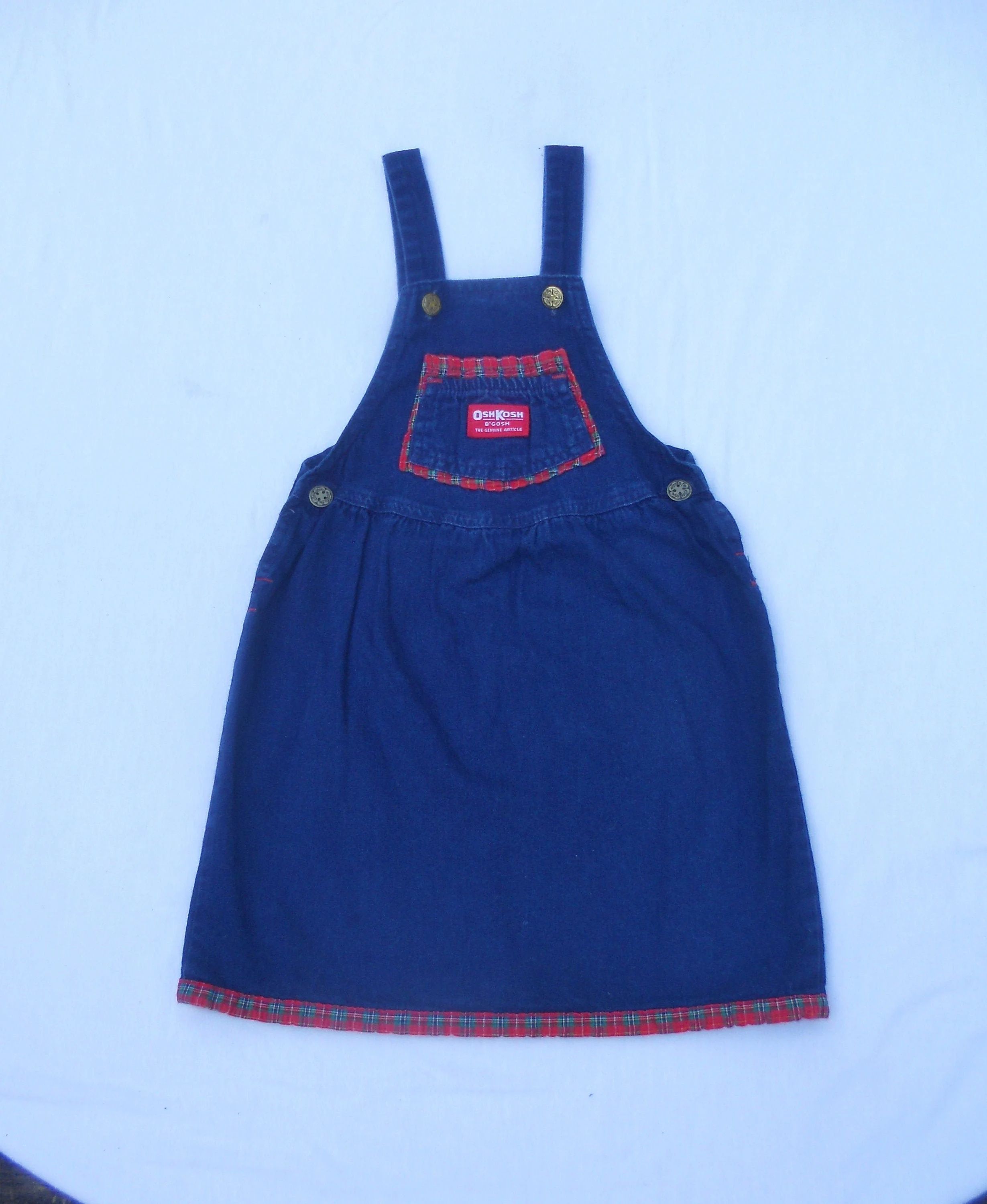 You are viewing a extremely Vintage UNION MADE USA Original Blue Denim Jumper/Dress in little girls size 6, but always refer to the measurements below. This Jumper has straps with Shamrock Buttons and Shamrock rivets on each side at the waist, a front chest trinket double pocket with bright red logo patch, plaid accent around the hemline, a small elastic panel on the rear waist, and of course...Vestbak. The Fabric: 100% Cotton Denim. Made in the USA. This is the only article of Osh kosh clothing I have with "B'Gosh" Buttons. Measurements: waist: 24" --Length from shoulder top to hemline: 25.5." Condition: In good shape. This is a dark lightweight denim. If you are interested in Vintage Kids Brand name, mostly made in the USA. Favorite me. I will be slowly listing many neat items! Thanks for looking!