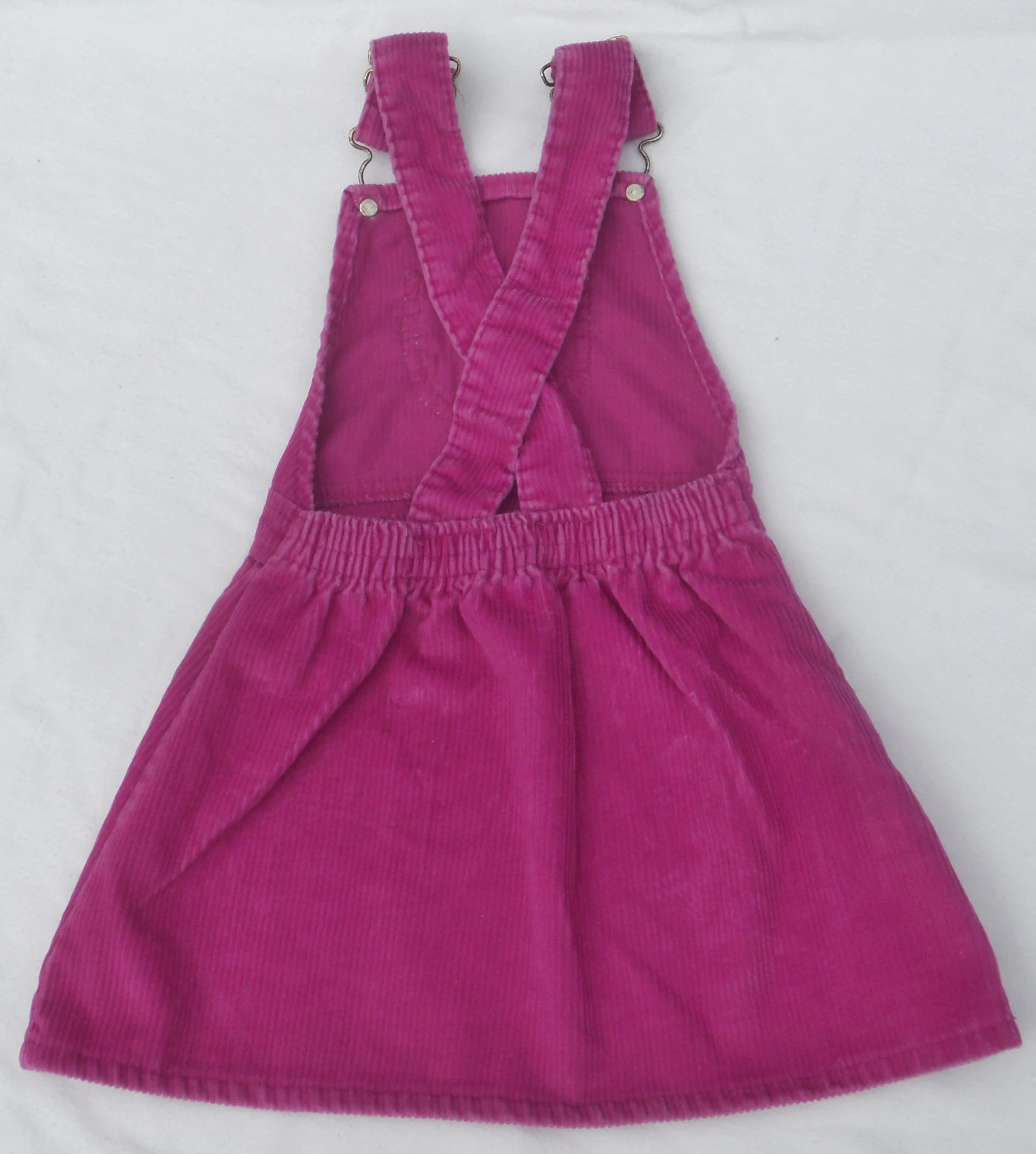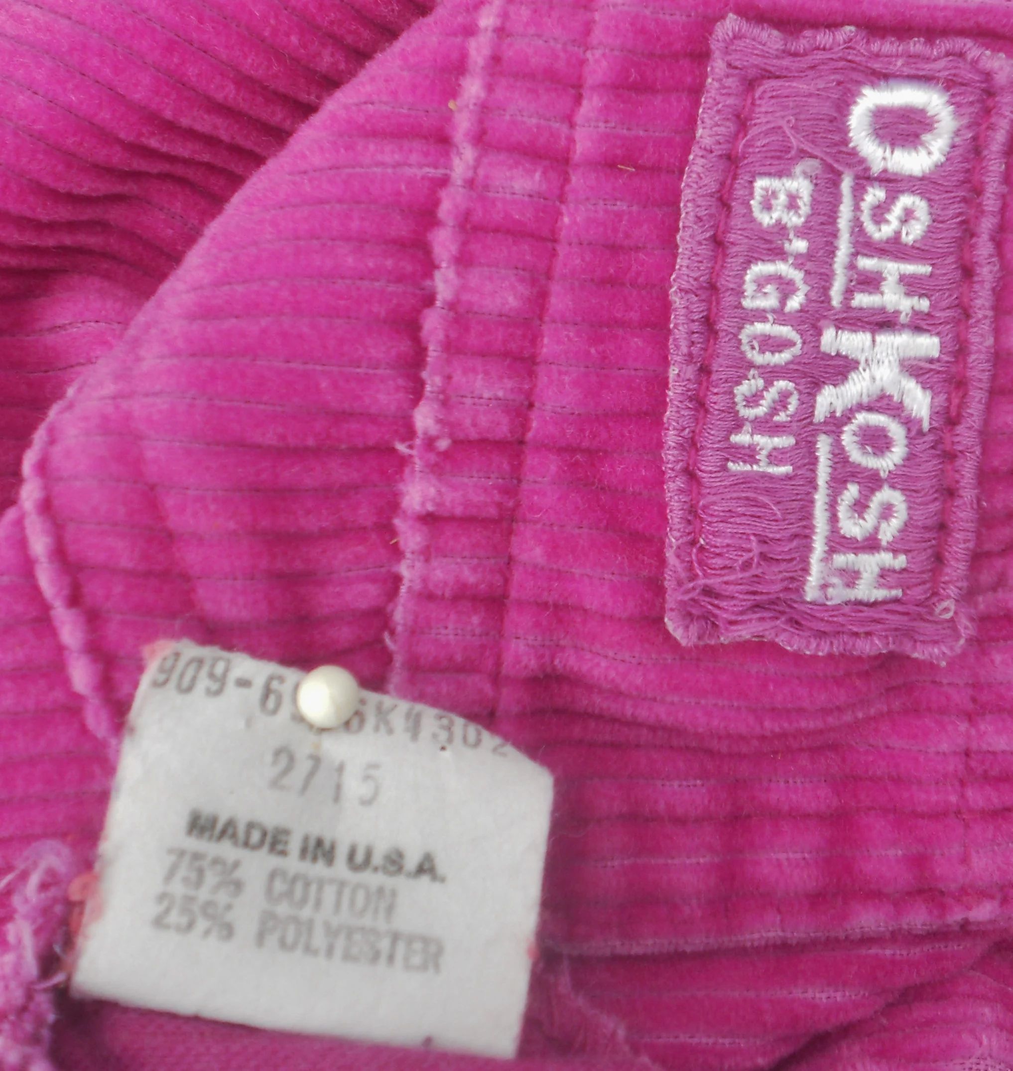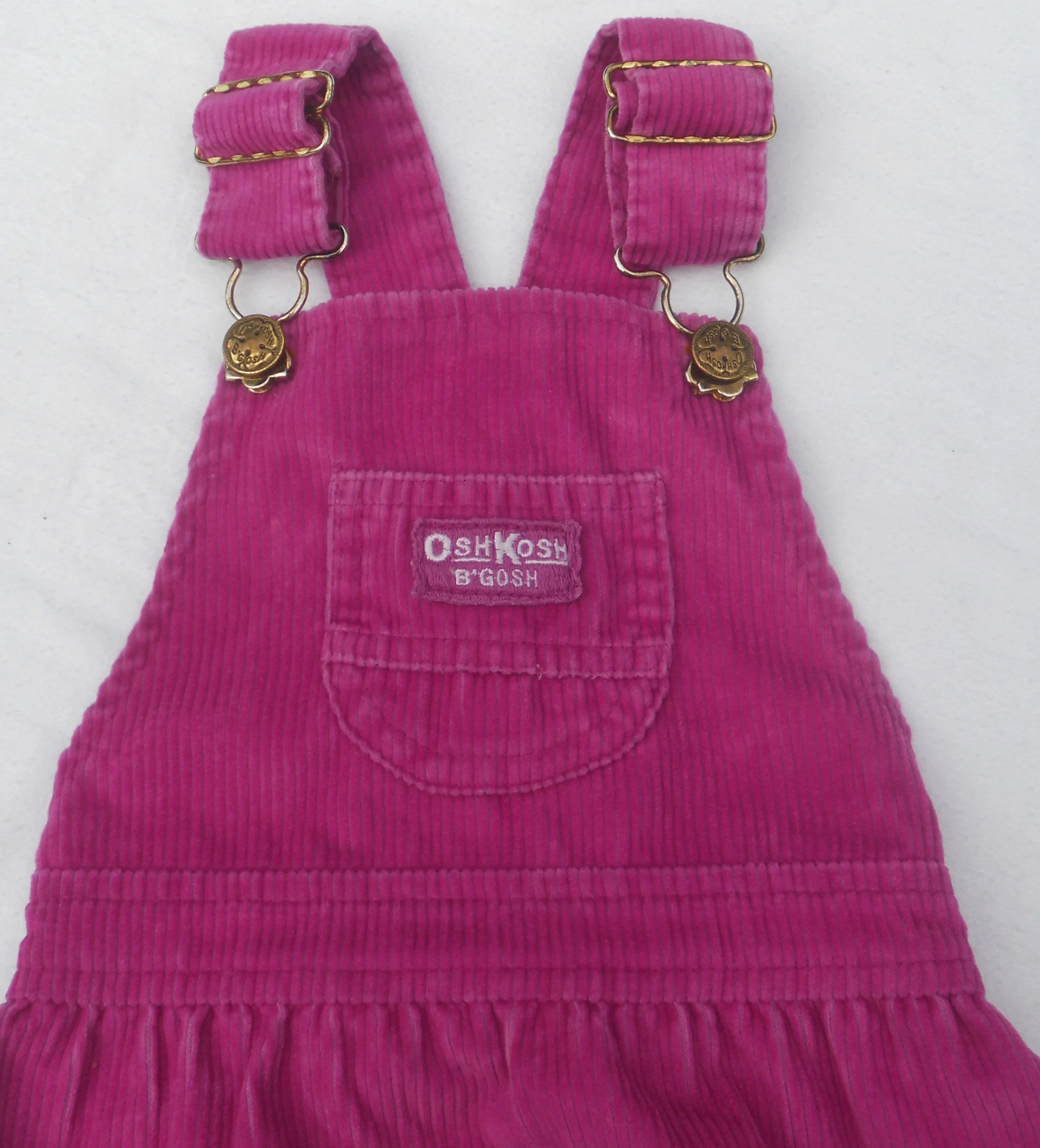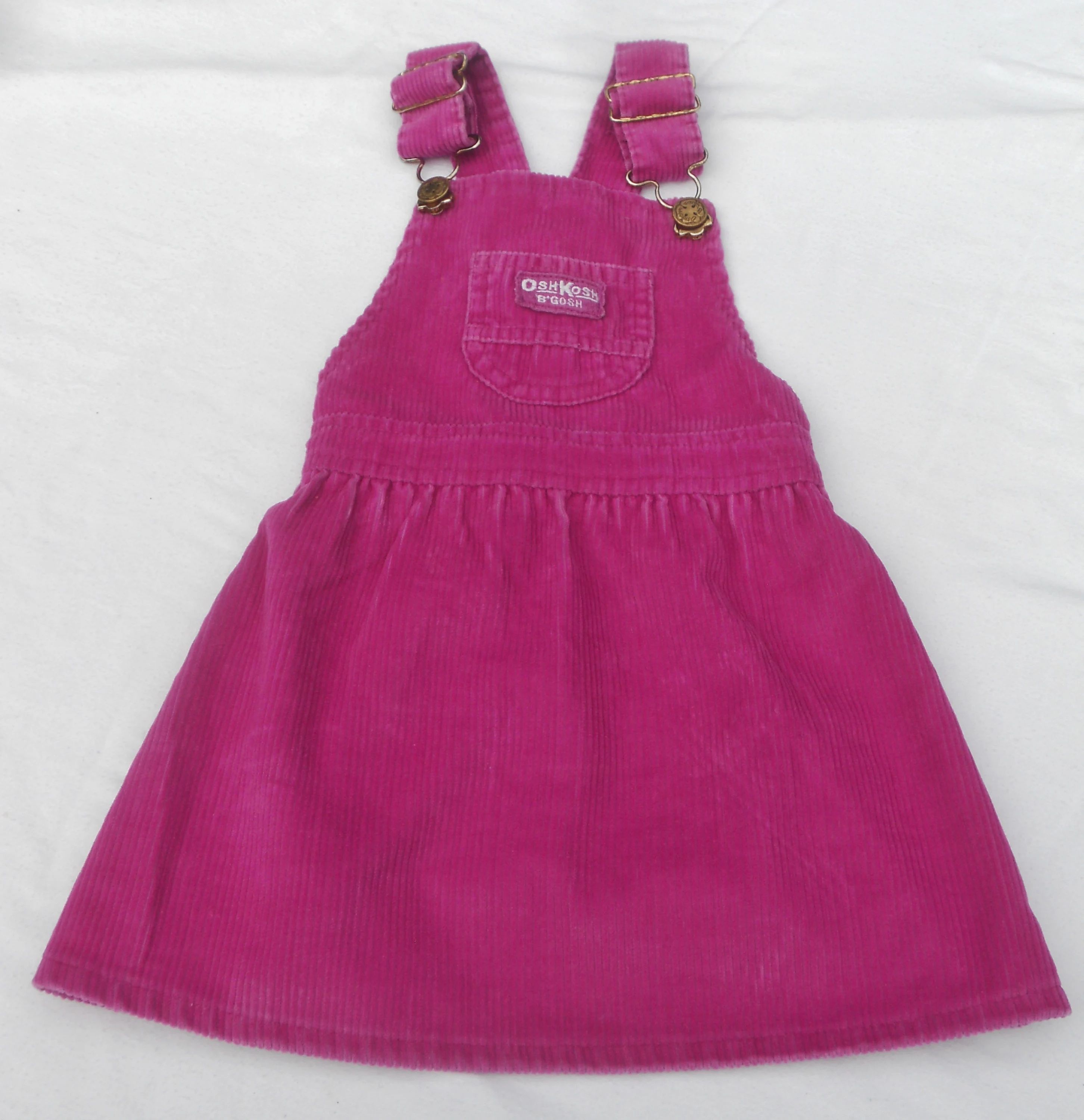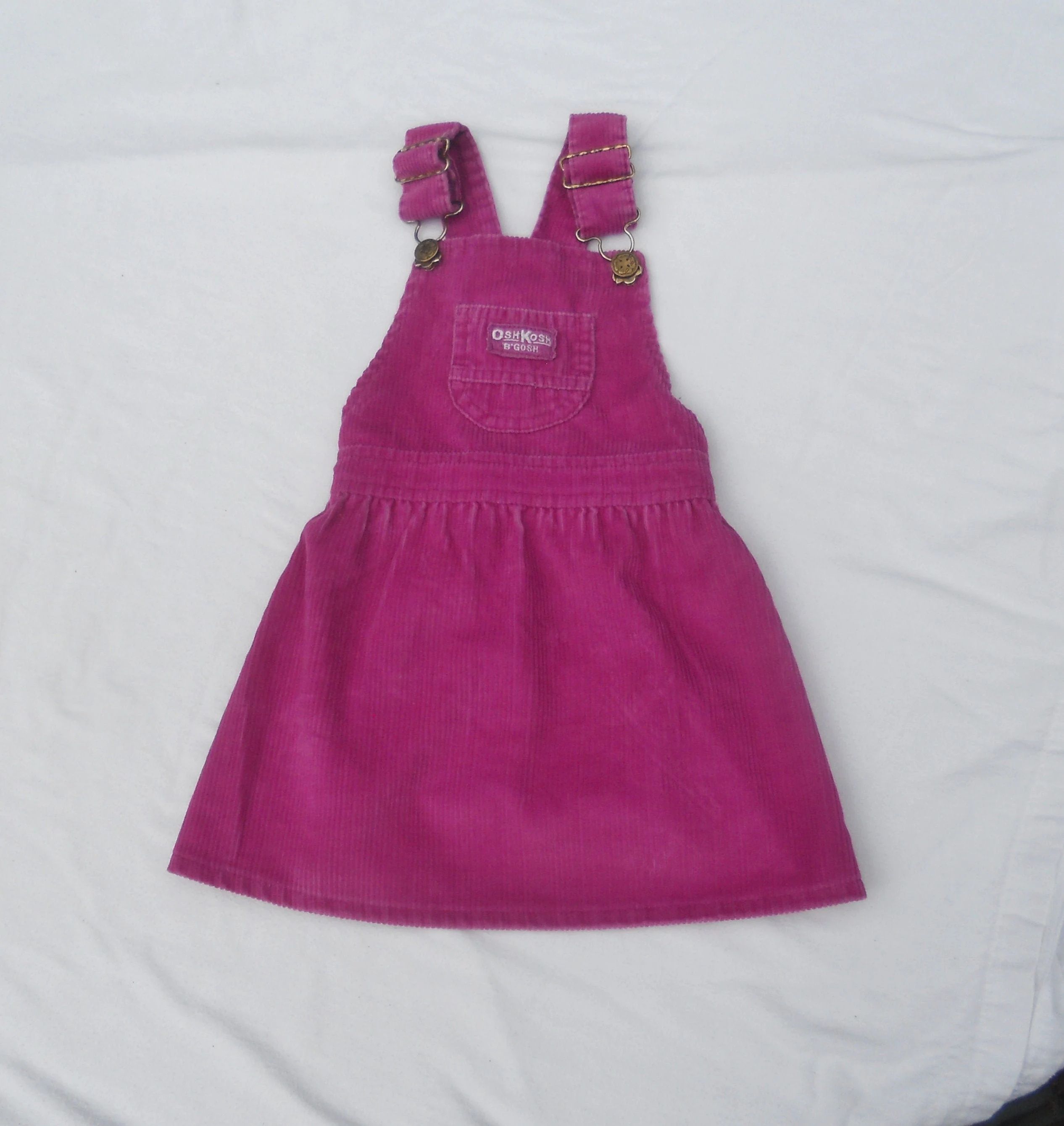 You are viewing a Vintage USA UNION MADE OSH Kosh B'Gosh CORDUROY Jumper for a toddler Girl is size 3T. NOTE: The color is much brighter than the pics. The close up photos with the UNION patch is fairly TRUE. This jumper has a front chest trinket pocket with the traditional logo patch in pinkish-purple (matching the jumper), adjustable Shoulder straps with Buckles & Osh Kosh shamrock riveted Buttons, criss-cross strap rear and an elastic waist in the rear. The Fabric: 75% Cotton -25%. Made in the USA. This little frock is in fair vintage condition with fading. And the osh Kosh logo Patch looks worn. Measurements: waist: 19-21"--Length from shoulder top: 20". If you are interested in Vintage Kids Brand name. mostly made in America & eclectic items, Favorite me. I will be slowly listing 100's of neat items! Thanks for looking! FREE SHIPPING!