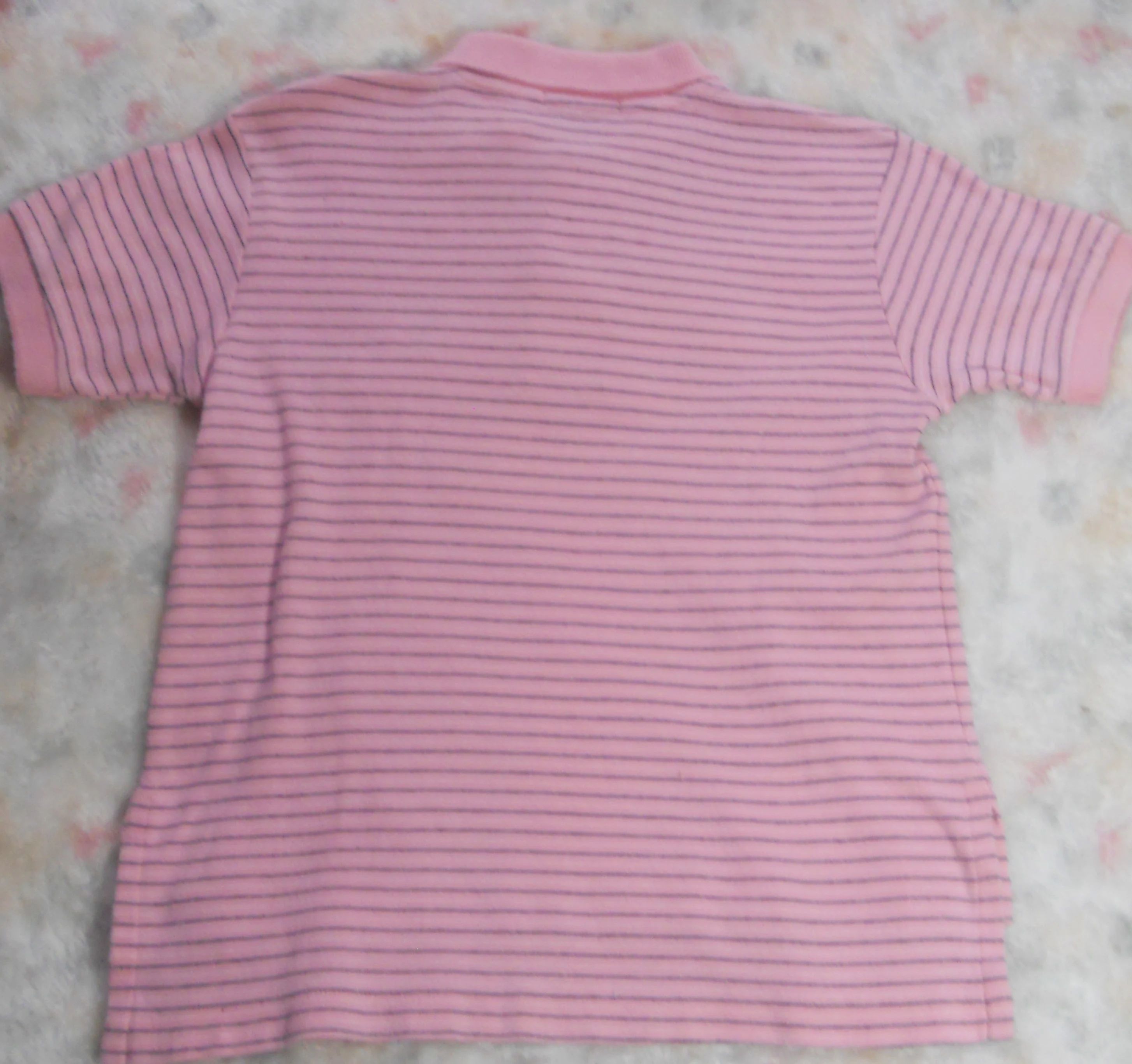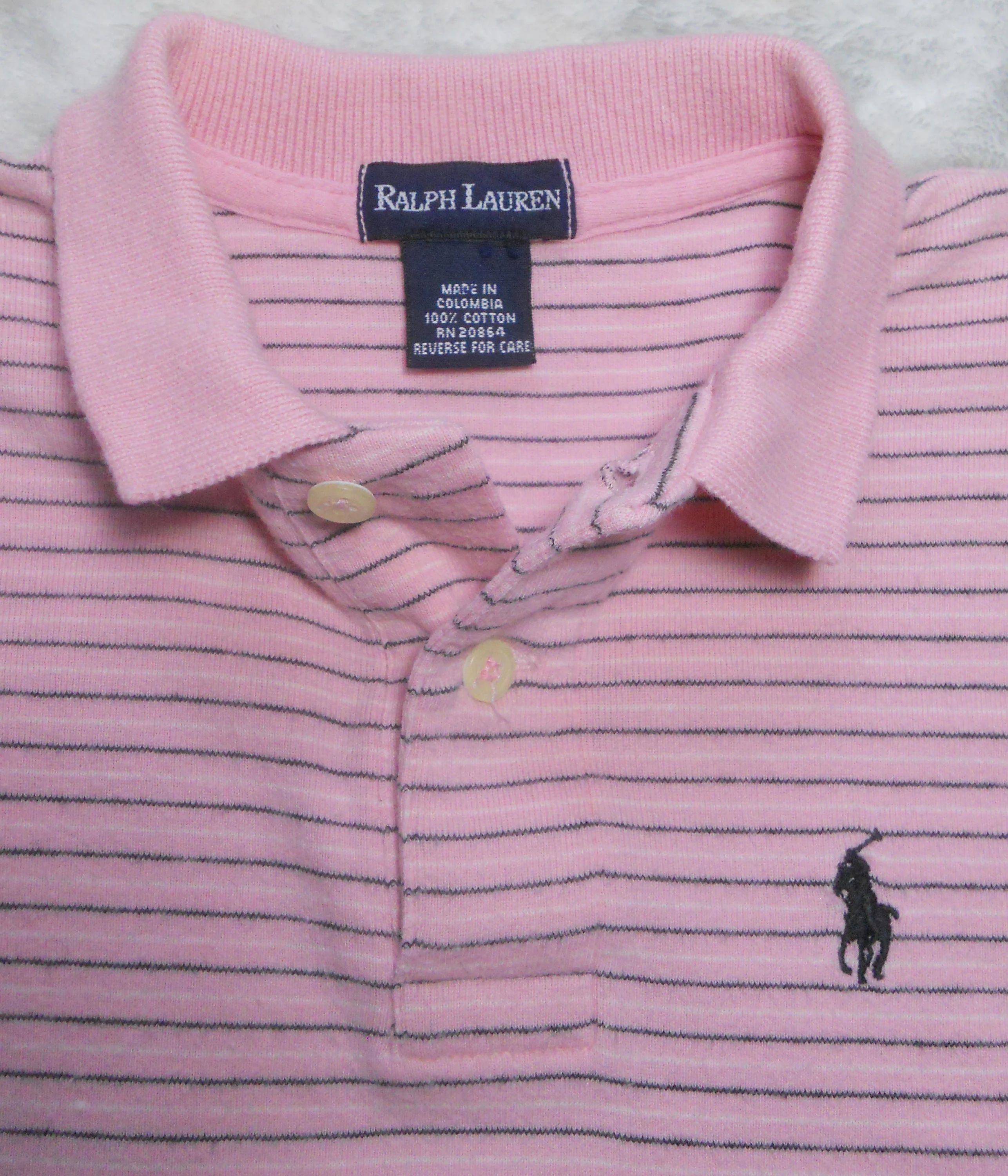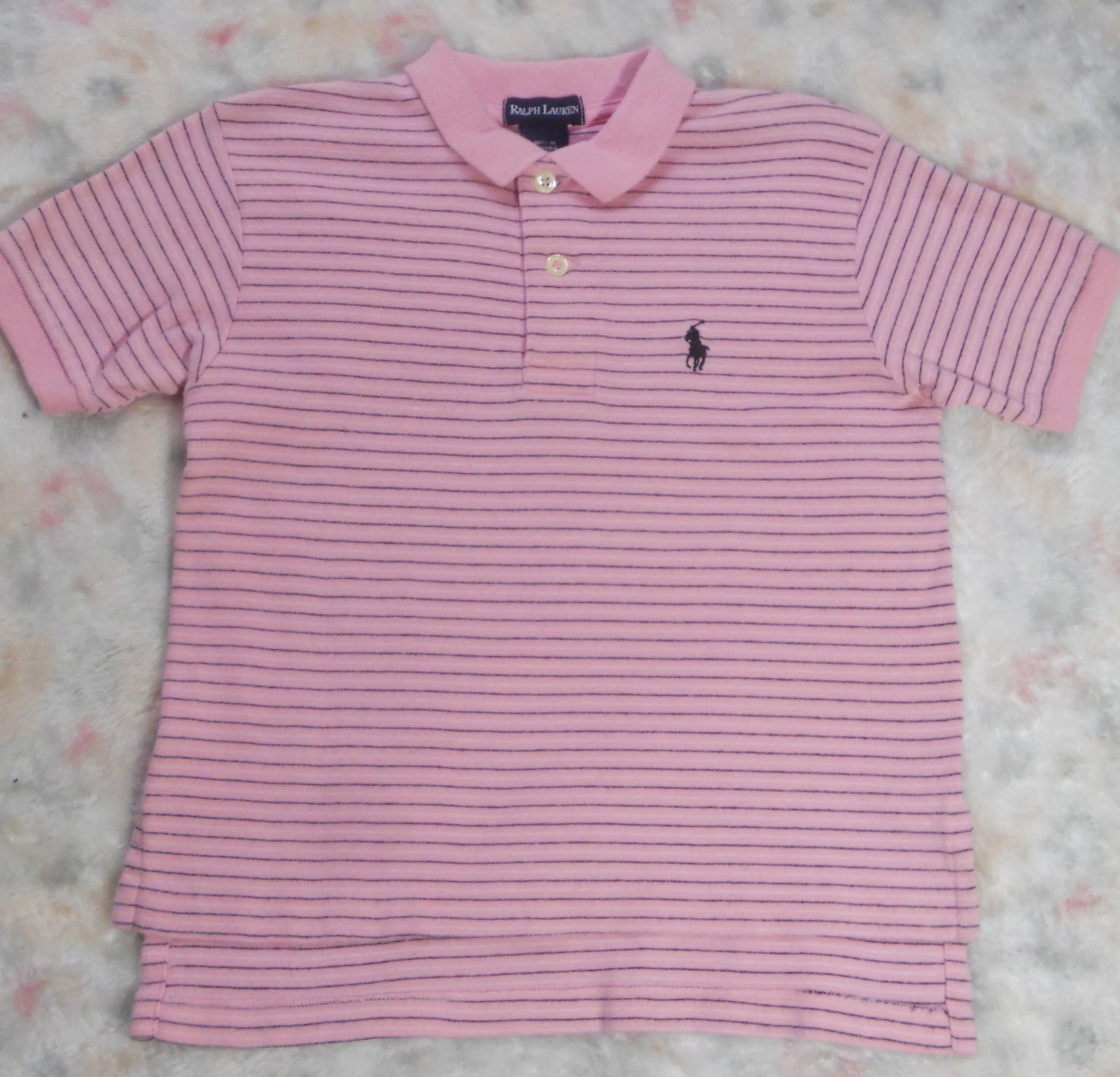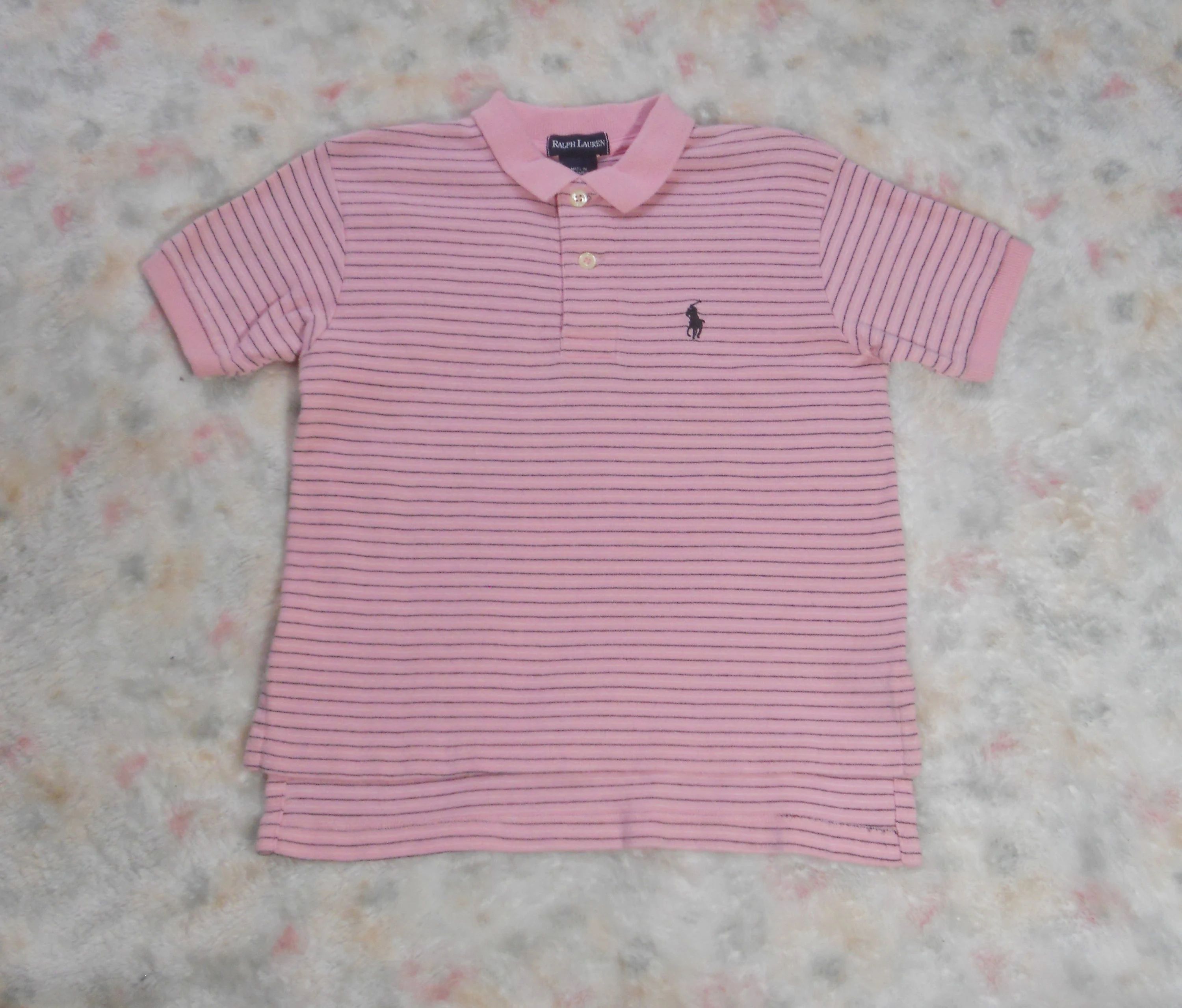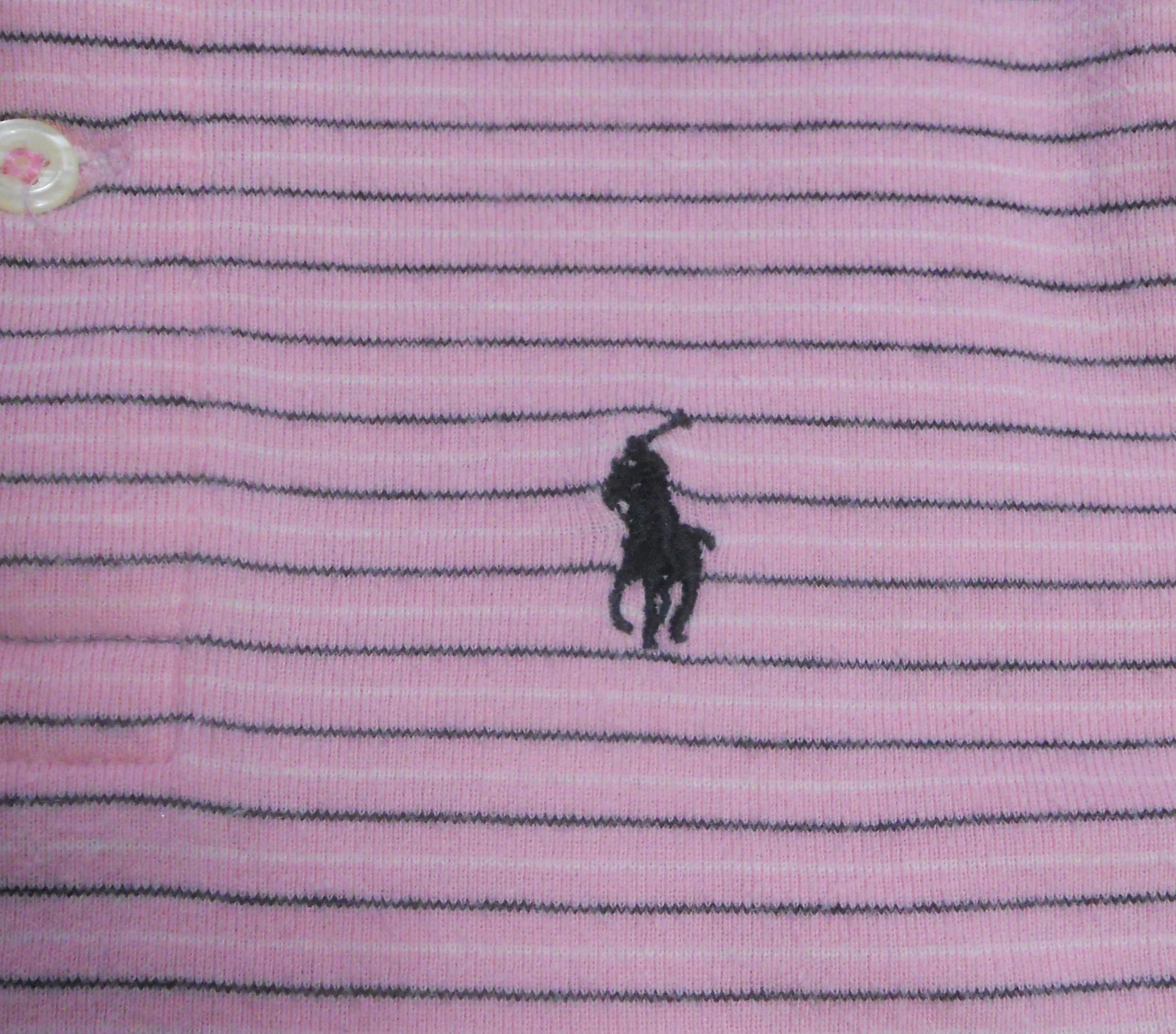 You are viewing a Vintage 90’s Ralph Lauren Short sleeved Pink striped POLO shirt with the well known RL Navy blue polo pony on the chest. No size tags but measurement = 6/6X, so refer to these measurements. The back hemline tail is longer than the front. (see pic) 2 button opening at top, ribbed collar & sleeves in 100% knit Cotton. Made in Colombia. Condition: In good shape. Measurements: Around chest: 28”~~ Rear Length from top edge to hemline: 18”. If you are interested in Vintage Kids Brand name & eclectic items, Favorite me. I will be slowly listing many neat items! Thanks for visiting!