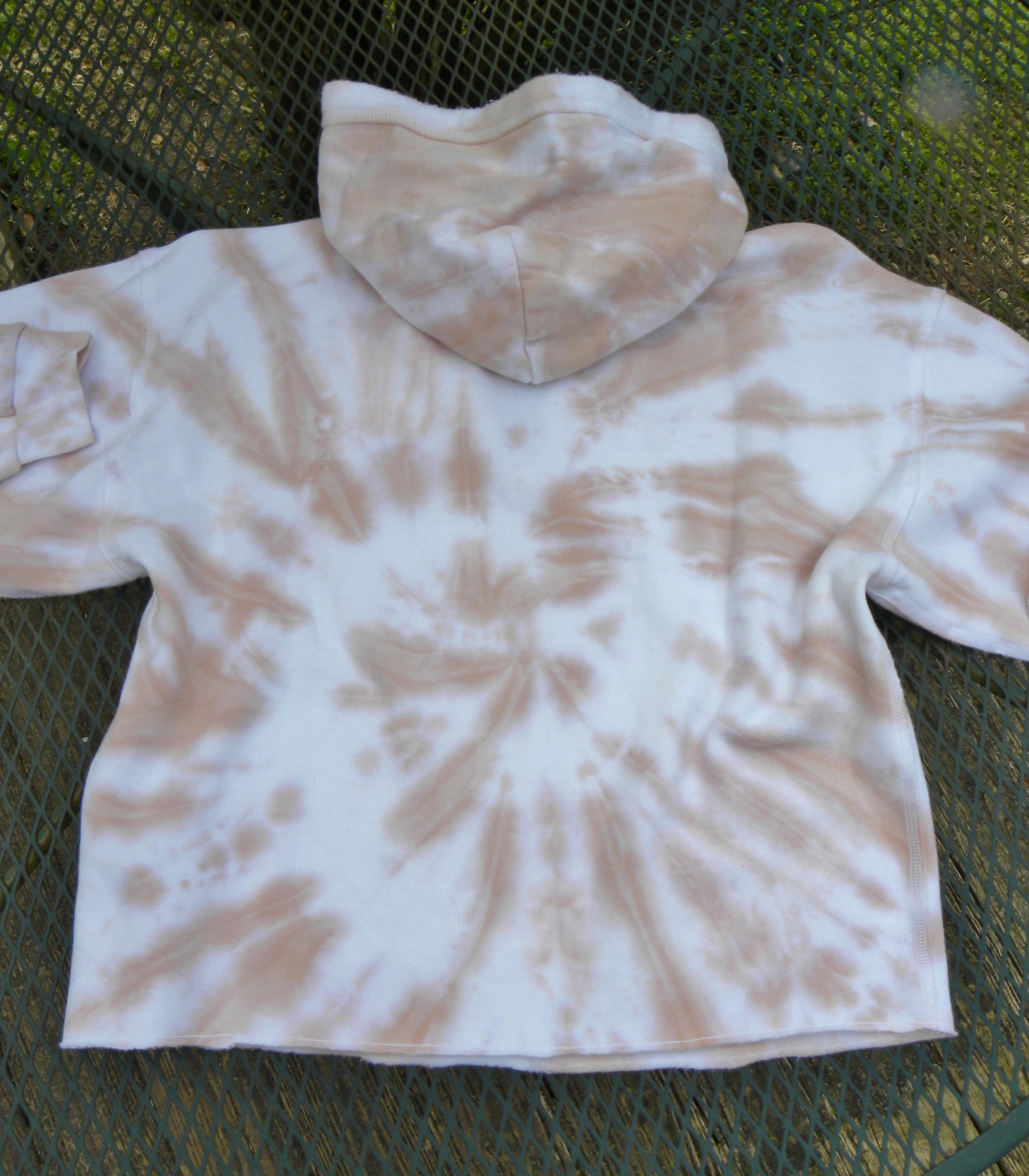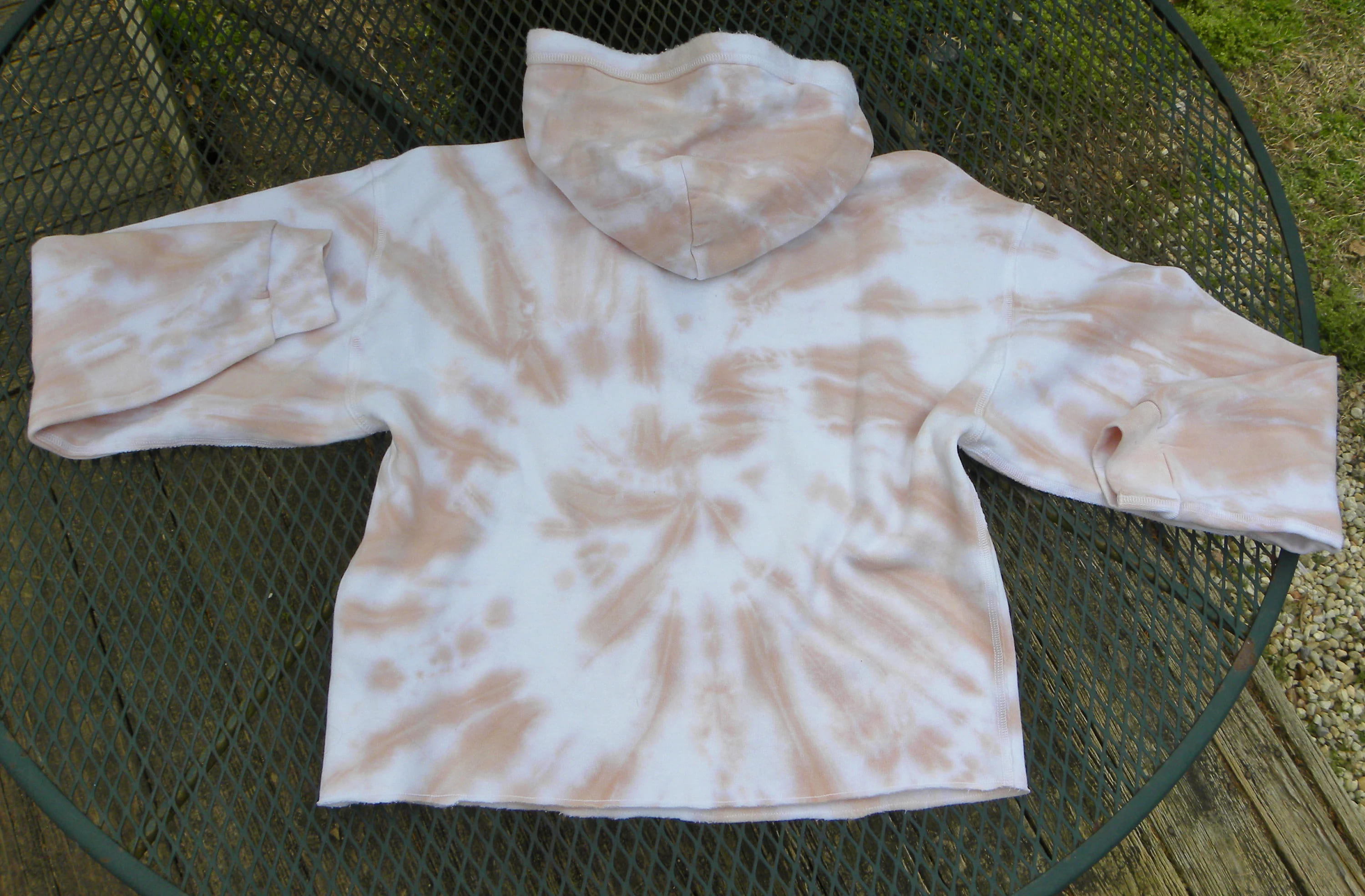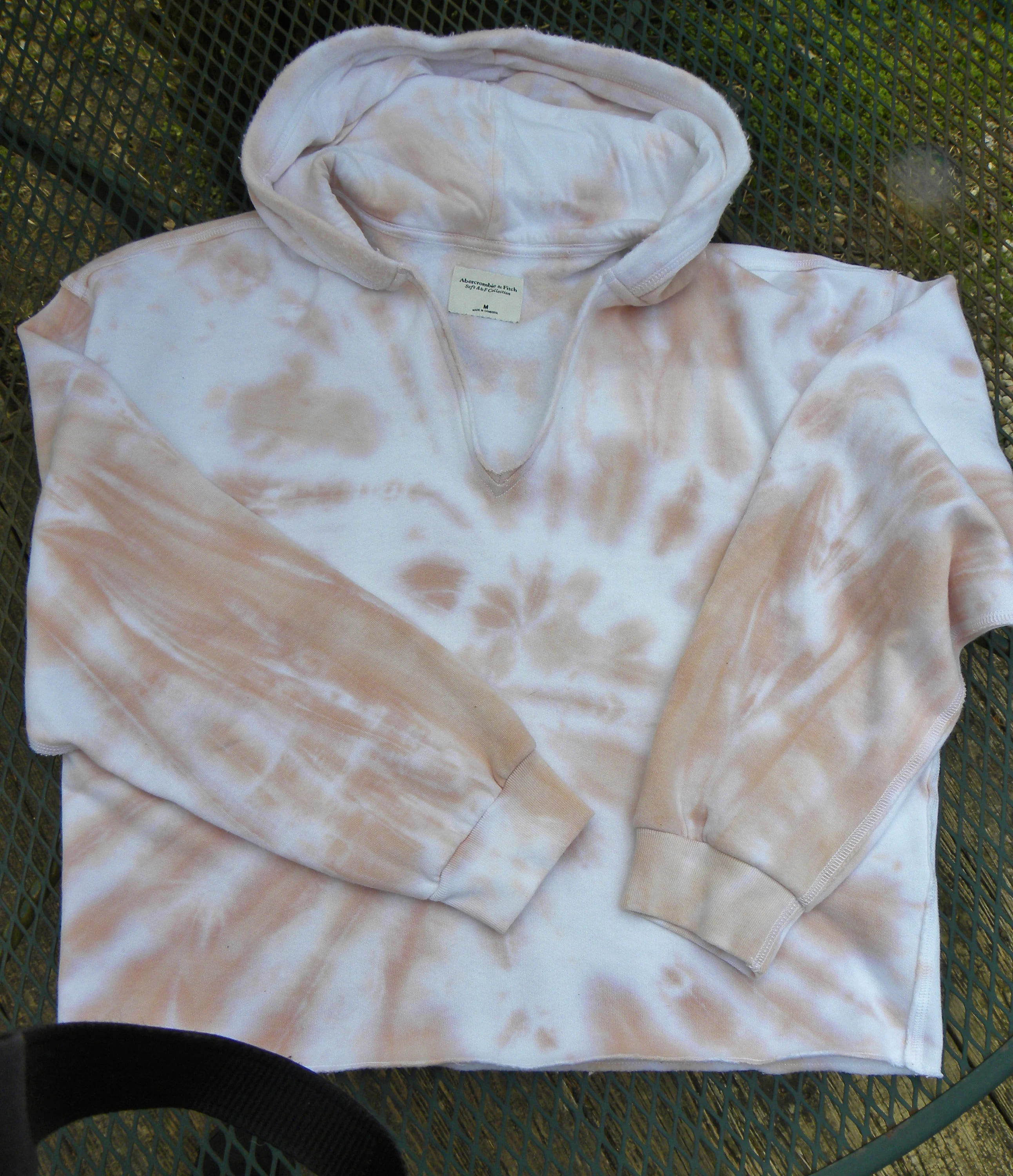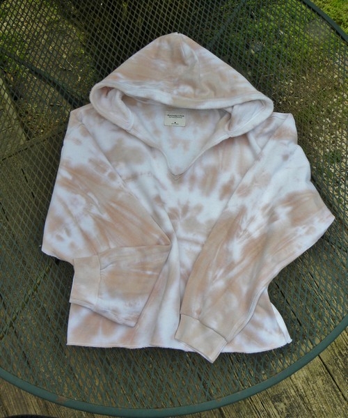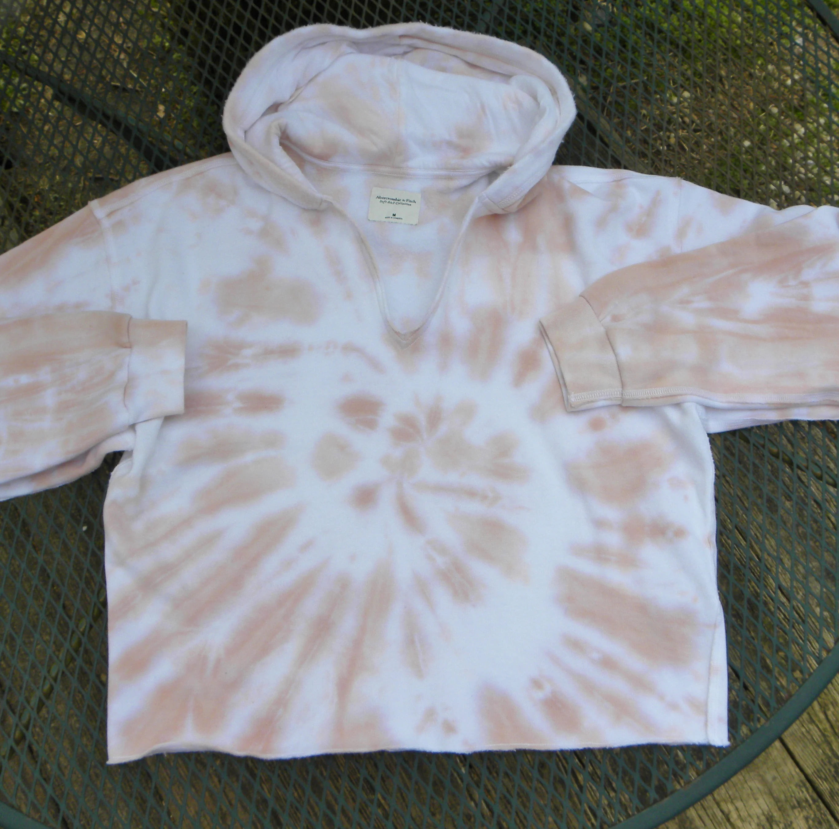For Sale: Preowned Vintage Abercrombie & Fitch Popover CROPPED Tie-Dyed Hoodie in Womens Medium. Dusty Peach & white. SUPER SOFT! From the cozey Soft A & F Collection. Open split V-neck neck, fleece interior. GO BY THE MEASUREMENTS!