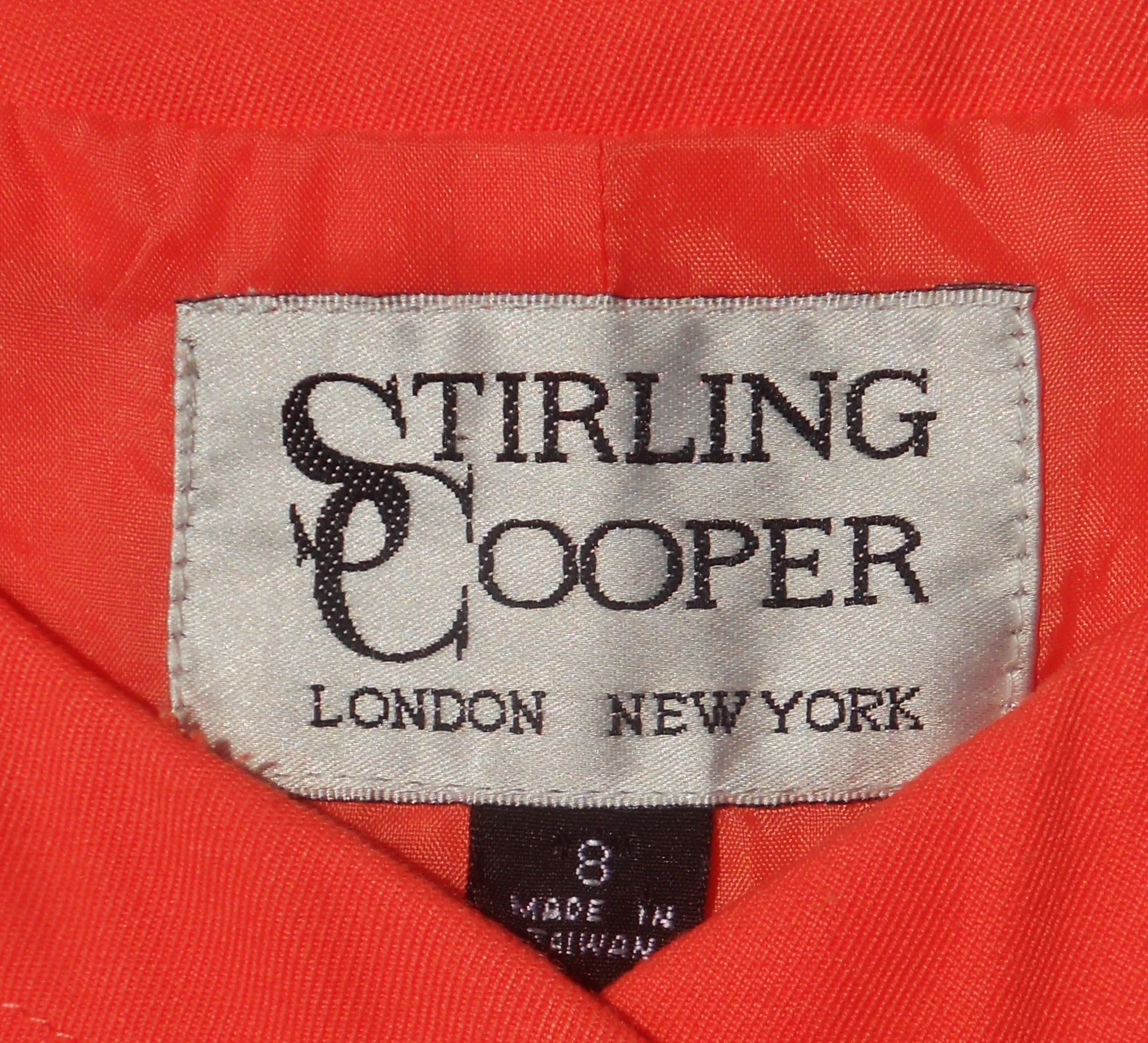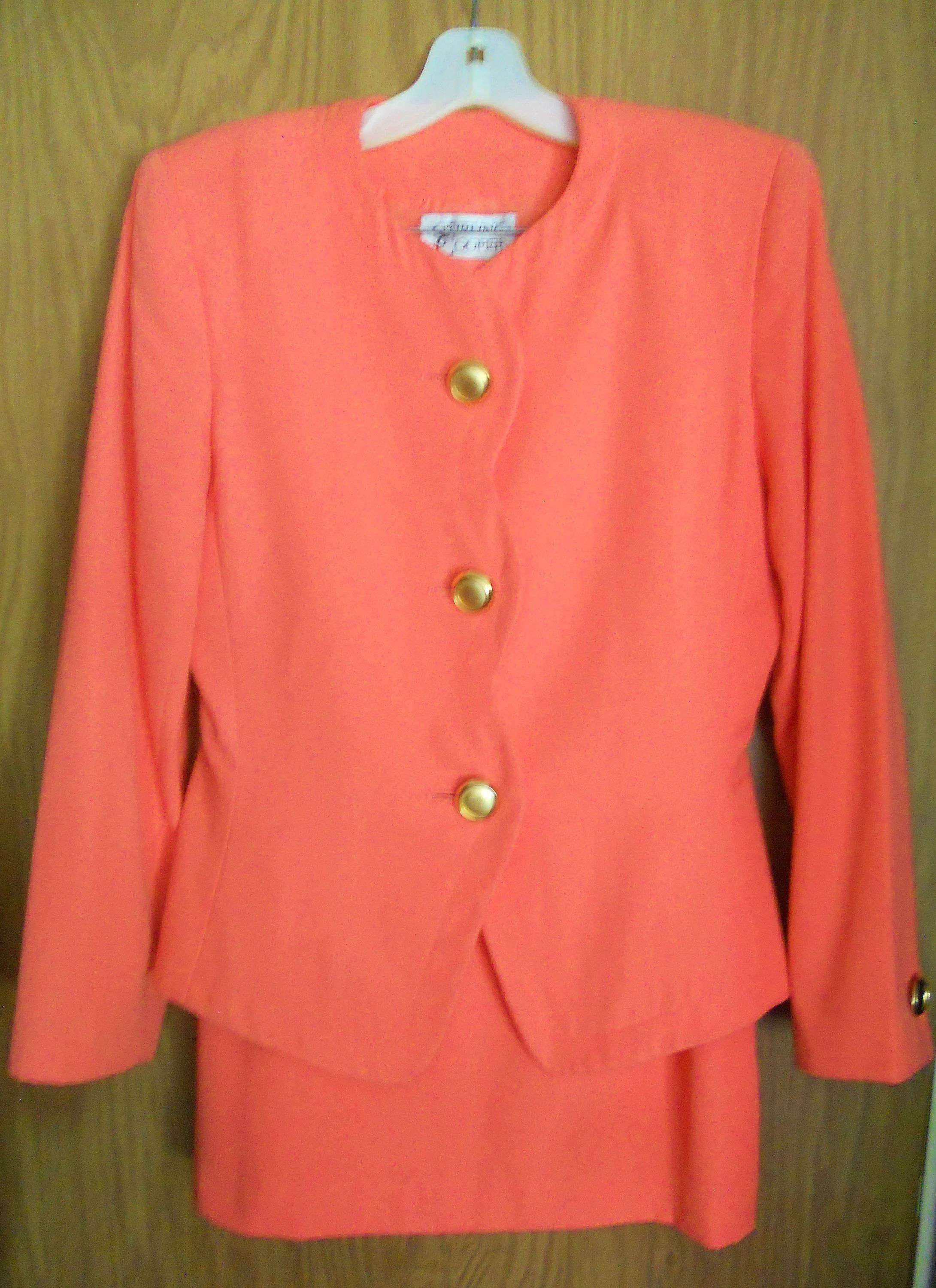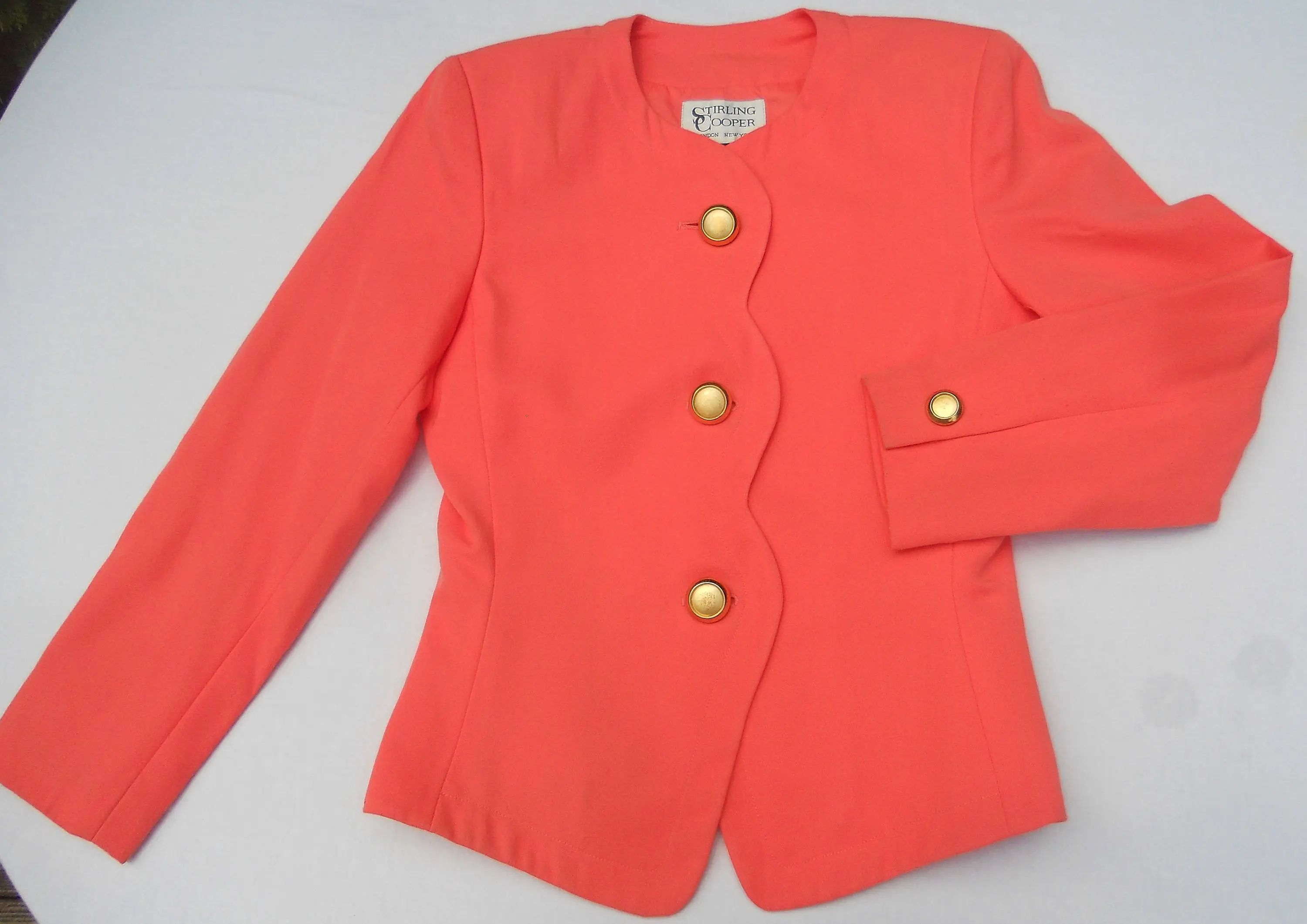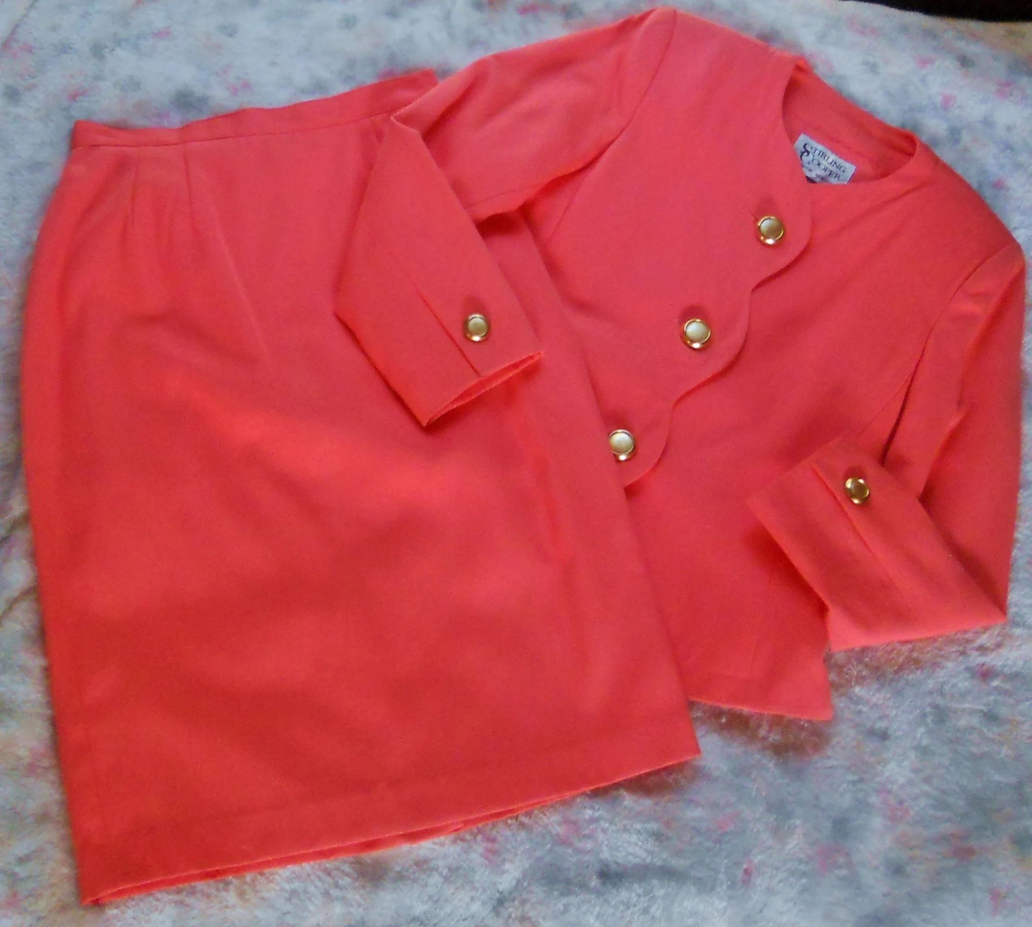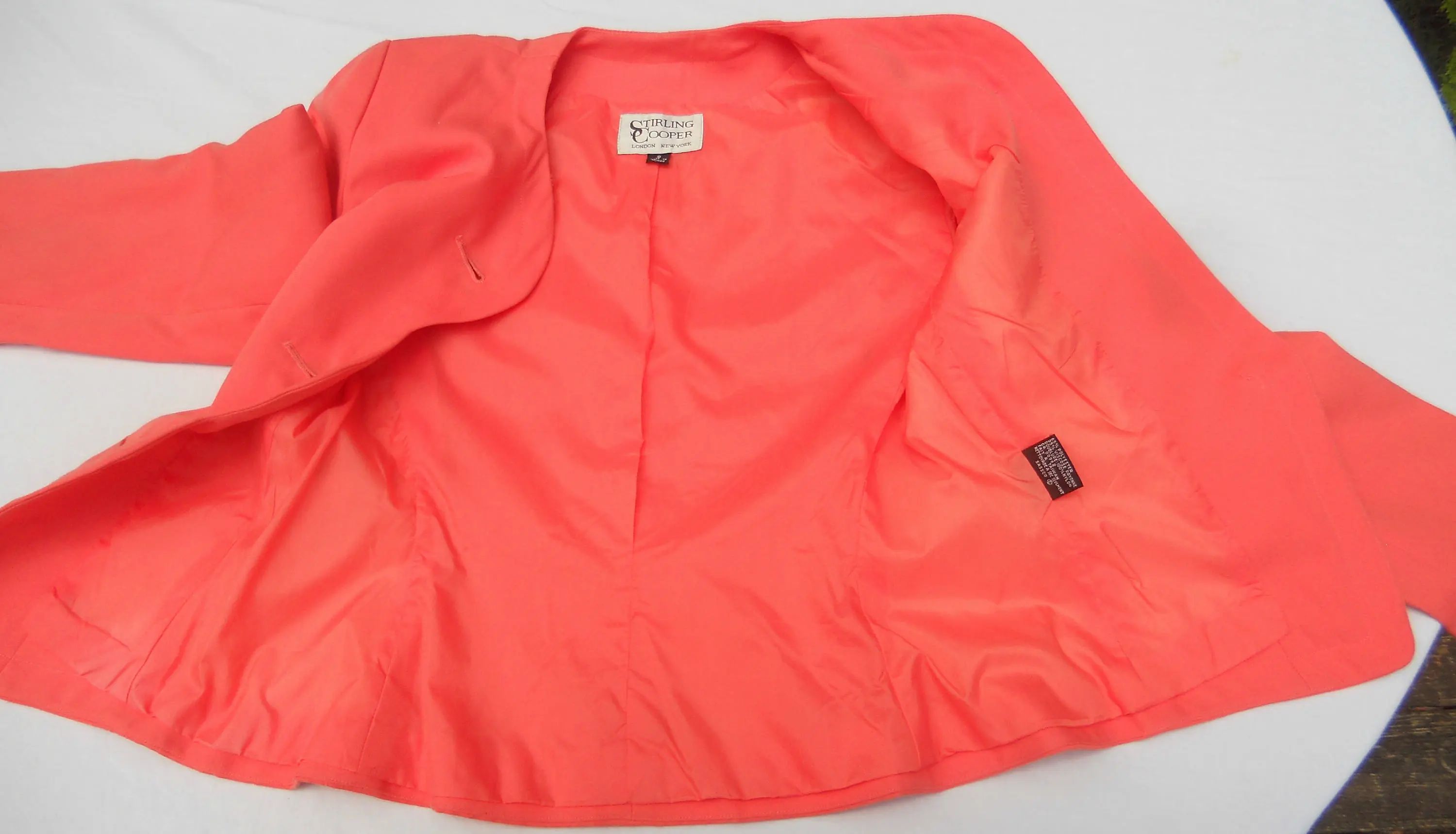 This Skirt Suit looks like is walked off the set of DYNASTY!!! This listing is for a preowned VINTAGE 2 Piece Skirt Suit Set by Stirling Cooper for a Lady in size 8 but please go strictly by the measurements. This round necked Eton style Blazer is lightly lined and sports a scalloped front edge with 3 buttons (approx quarter sized) & padded shoulders. The lightly lined A-line skirt has a center rear 7" zipper & button and an 8" center rear kick pleat. The gorgeous Coral color will knock Your socks off. Retail: $165. Measurements: SKIRT> Waist: 27"~ Length:25.75" ~Approx Hip:40.5" ..... 3 Button JACKET> Buttoned Chest: 40"~Sleeve length: 23.5"~ Rear Length from top of shoulder: 23". NOTE: This Set has been in storage and will need to be cleaned. There is some soiling on the sleeve edges, top shoulders, hemline edges, but no large stains and no holes, etc. The buttons are scratched. Please look at EVERY photo so you know exactly what you are buying. Thanks for looking!