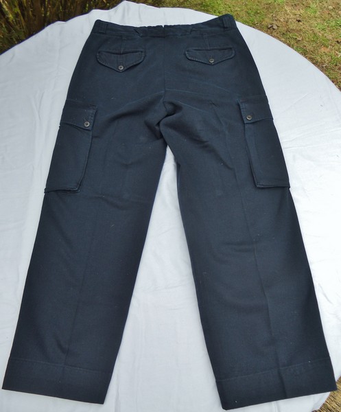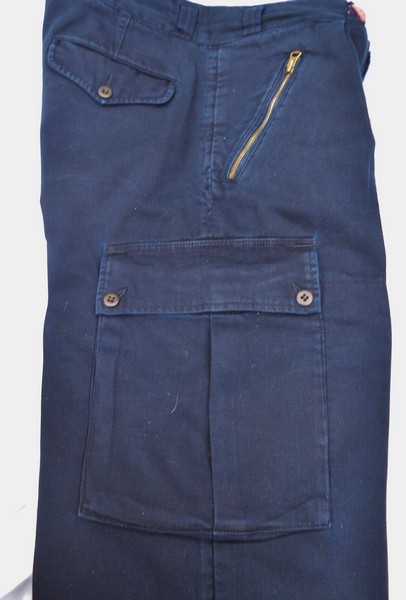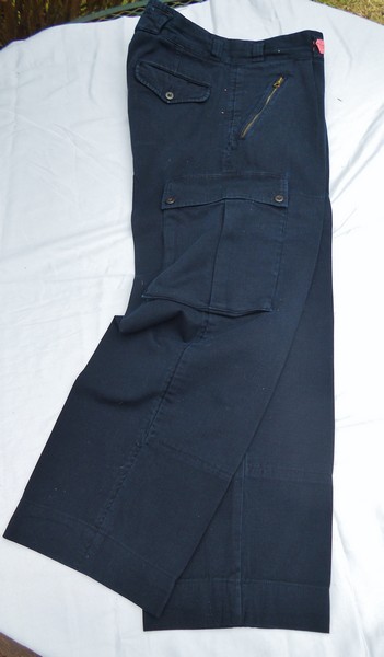 VERY RARE For Sale: Vintage POLO Ralph Lauren --Navy Blue Wide leg Cargo trousers/pants. size 36 waist. 5" zipper w/2 buttons above it waistband, a single pleat on each side in front. 6" zippered diagonal hip pockets. Two huge 8" X 9.5" buttoned/flapped Cargo pockets. 2 rear butt buttoned/flapped pockets. 6 narrow belt loops and 1 wide belt loop across back middle. Buttons inside for suspender braces. 100% heavy cotton made in Malaysia. These are heavy twill and were called Ralph Lauren SKI Pants. You cannot find these any longer.
